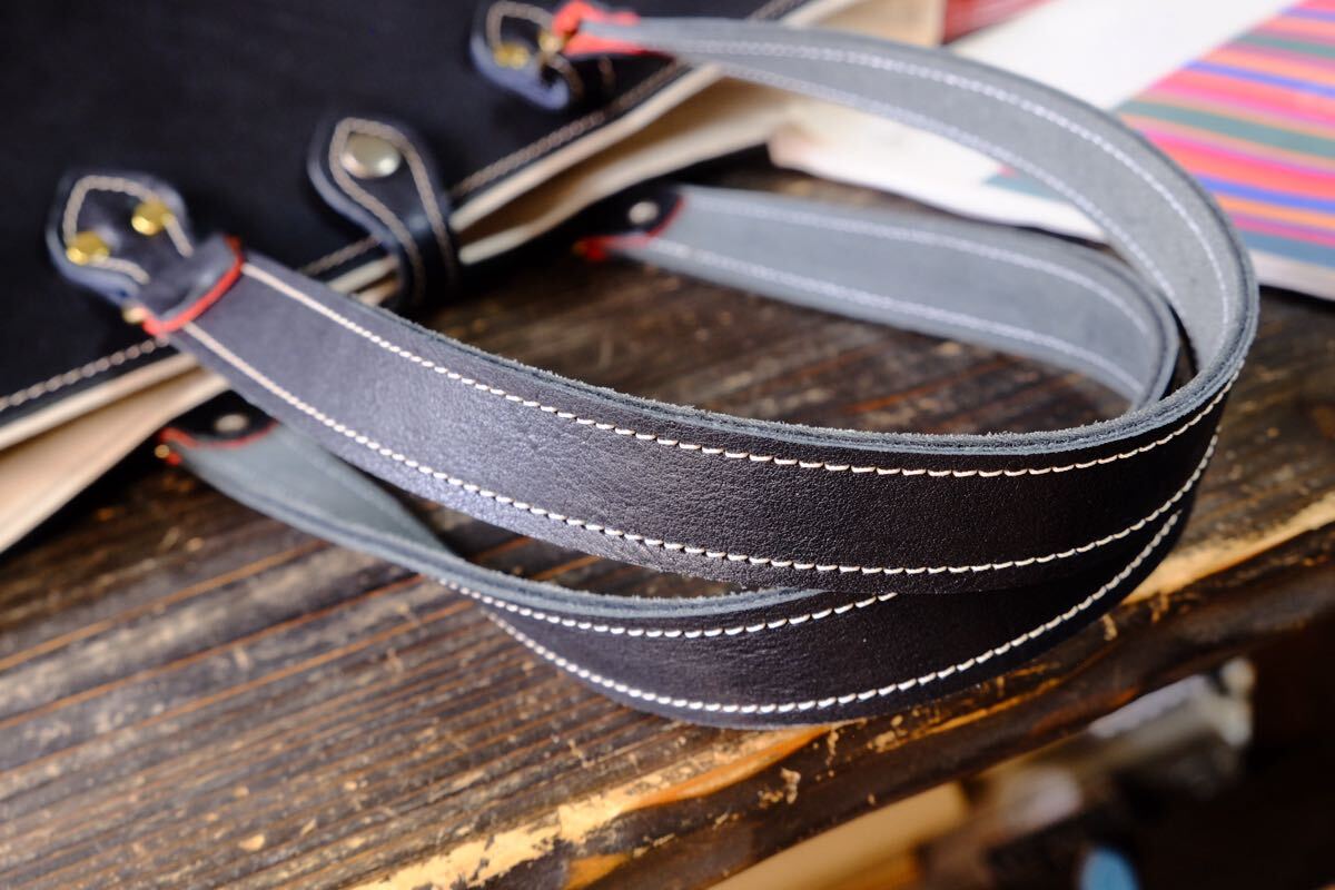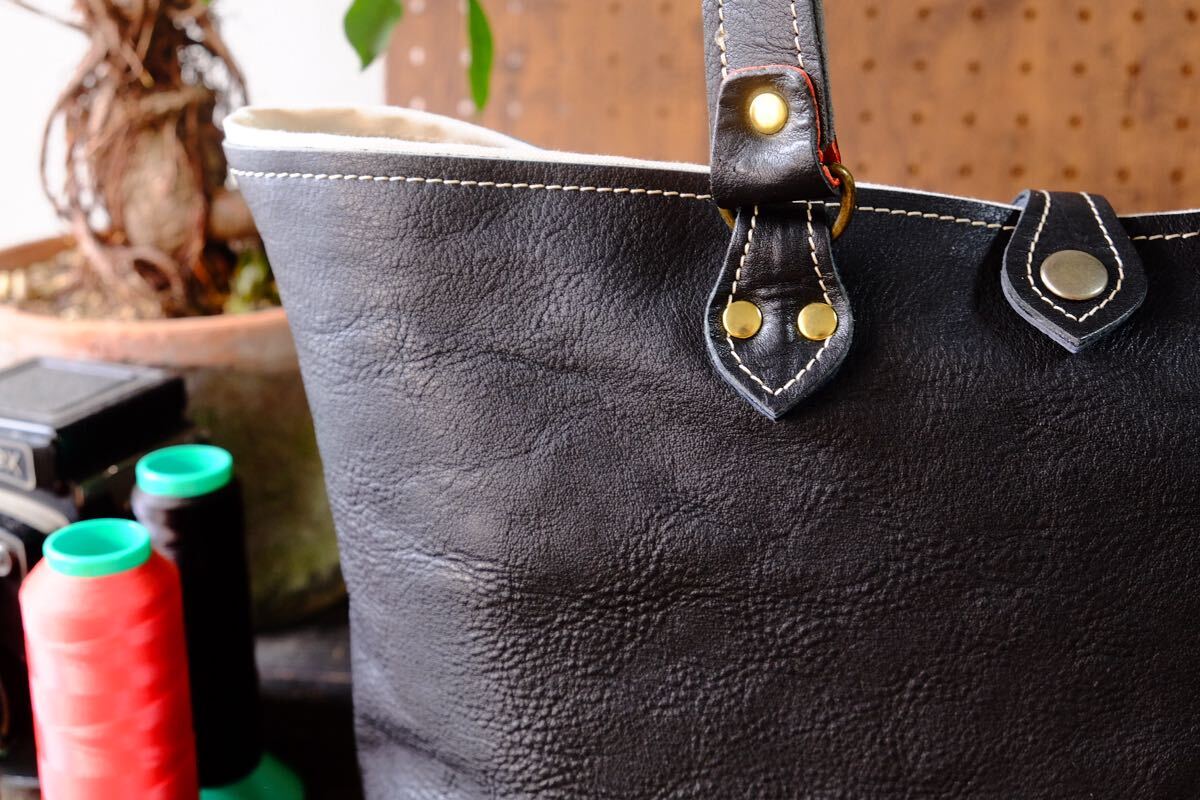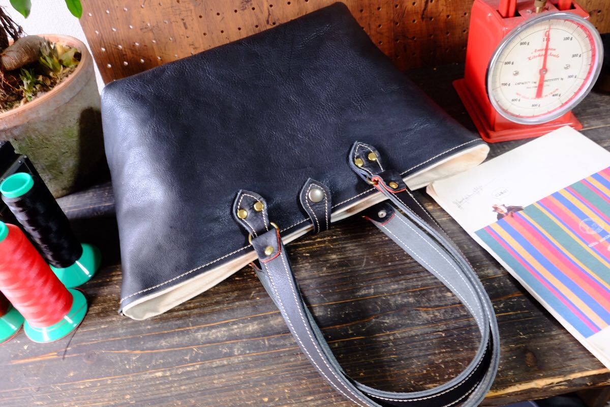 最後の一点になります国産の漆黒ブラックシュリンクヌメ牛革を中心に使用しクラシカルなデザインに仕立てました。裏地は丈夫な布でお創りしておりますので、耐久性とバッグとしての総合的な軽さを可能にしております。厚手で容量も多くの物が入り大変扱いやすいレザーバッグです。