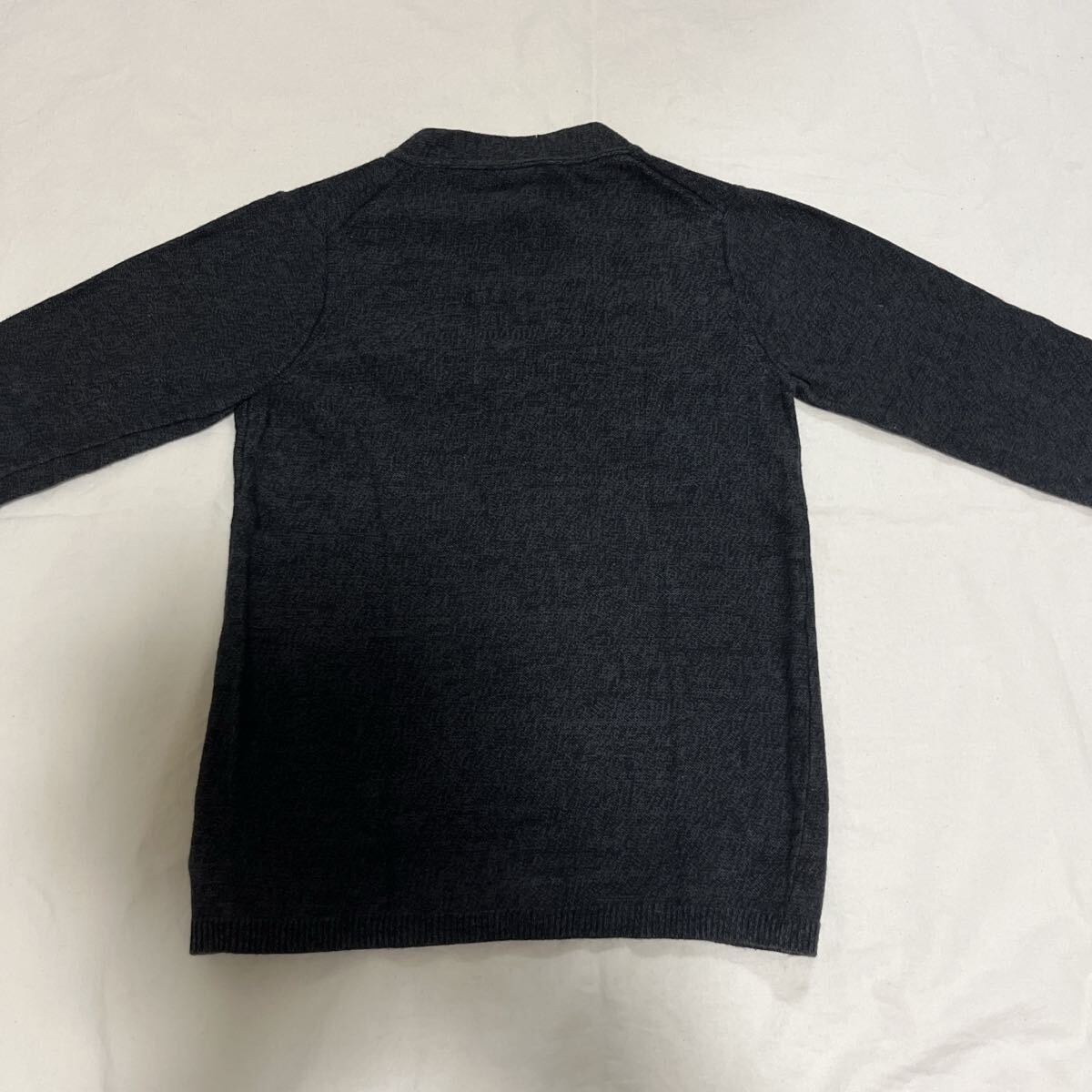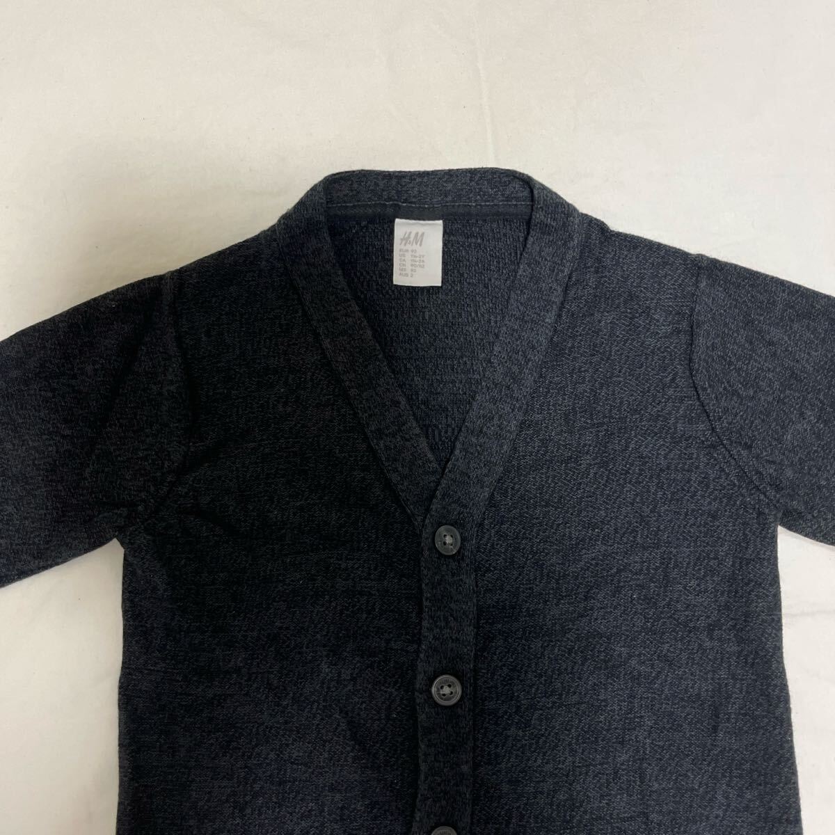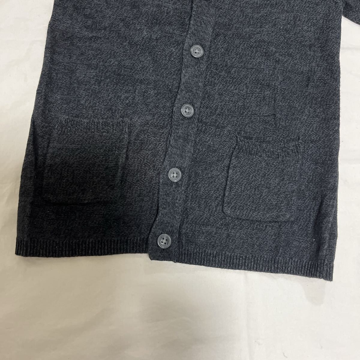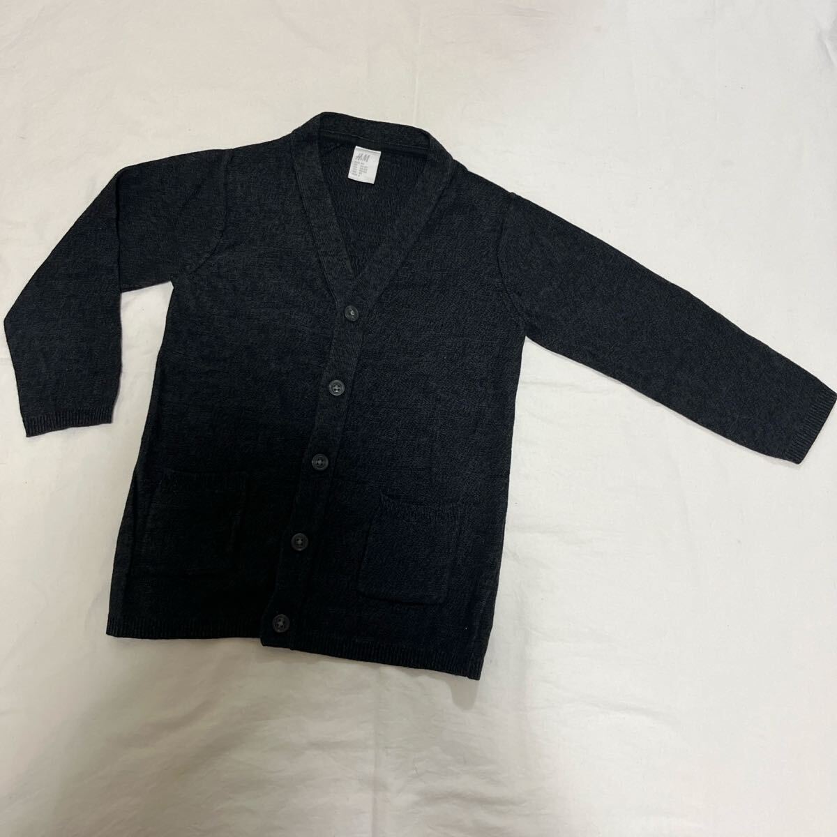 H&Mの綿100%のダークグレーVネックカーディガン、少し長めの丈でフロントボタンとポケット付き。
