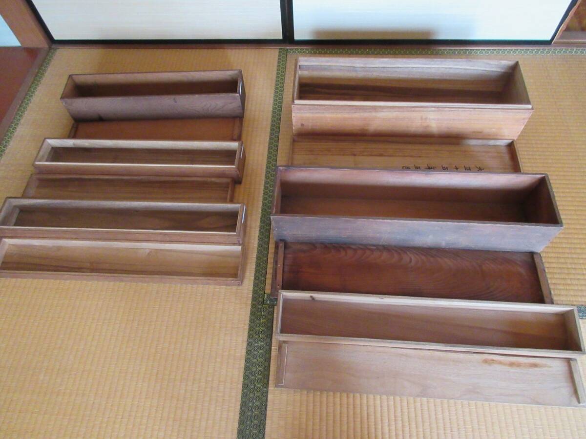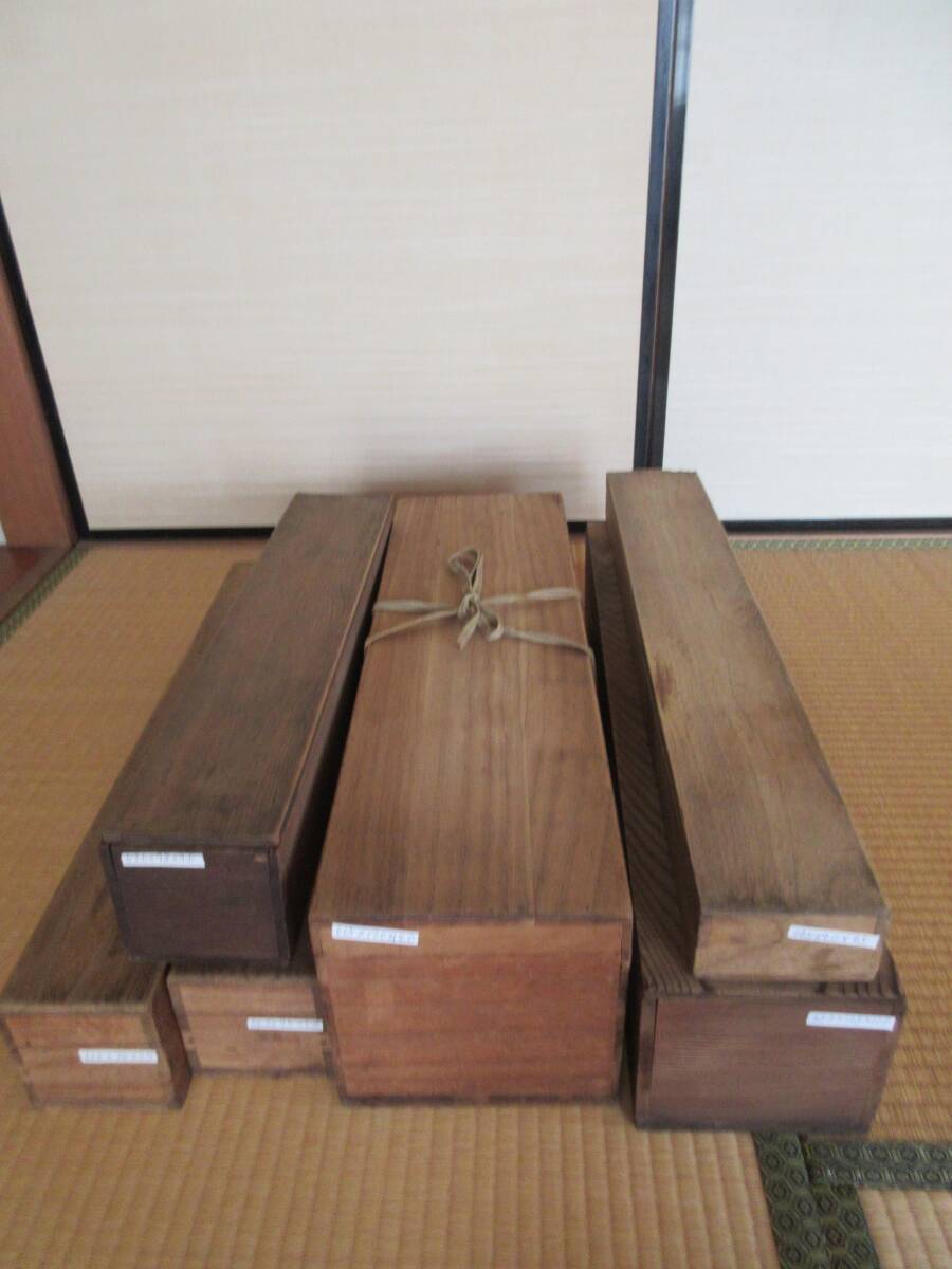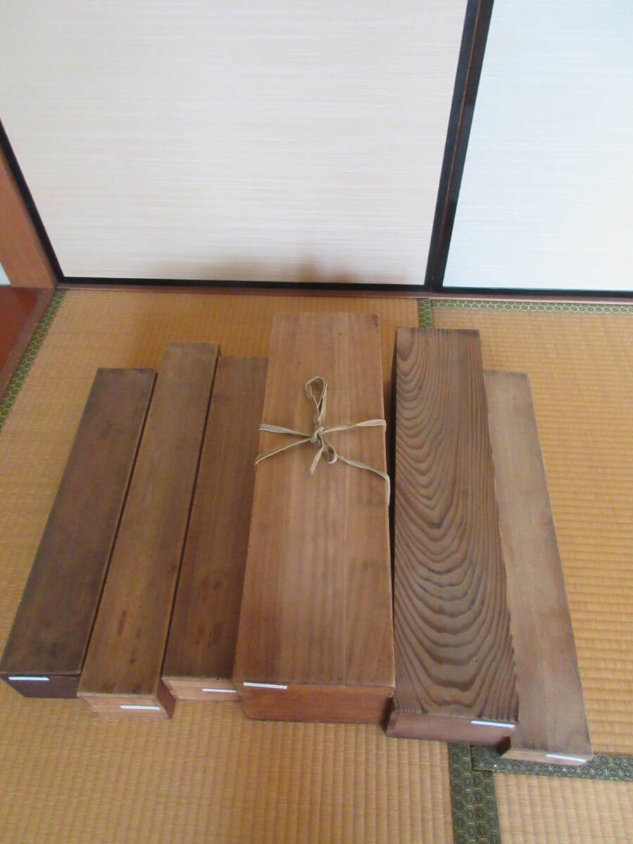 御覧頂いて有り難う御座います、軸箱 空箱 特撰別 桐 杉 6箱 特殊型 中古の出品ですかなり古い物もありますが、壊れているのはのけて墨書きのは水タオルで拭き取ってます。