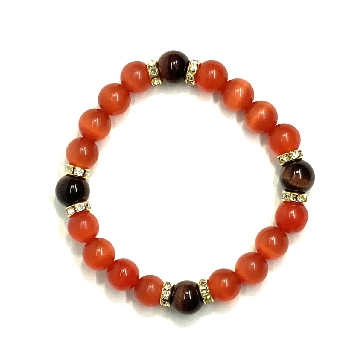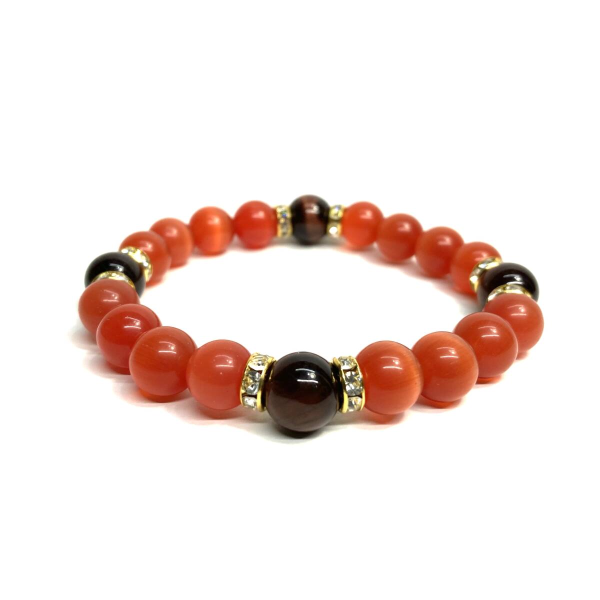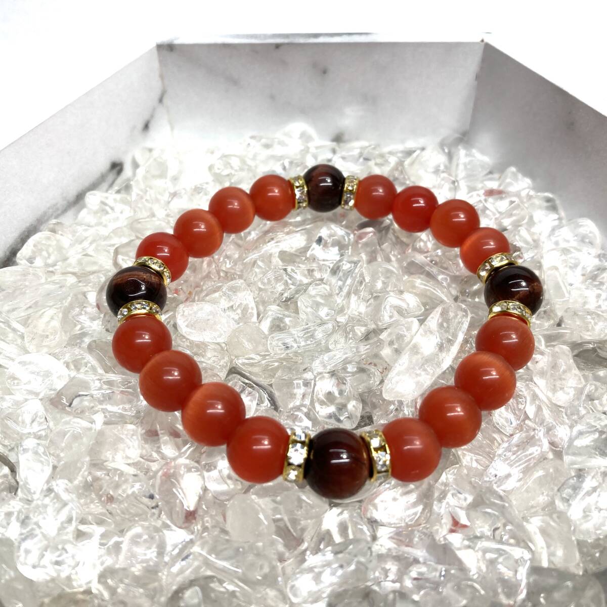 こちらは、キャッツアイとレッドタイガーアイを組み合わせたブレスレットです。間にはロンデルを挟み高級感あるデザインに仕上がっています。石大きさは腕にも馴染みやすいように10mm玉で内周約17cmです。数に限りがございますので気になる方はお早めにどうぞ。