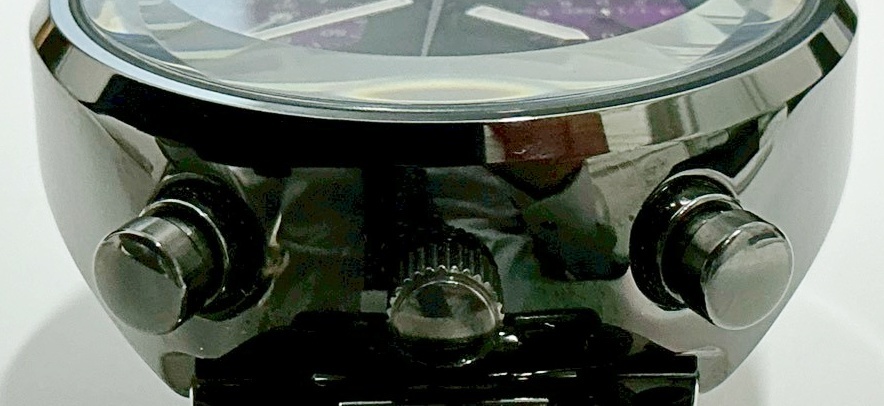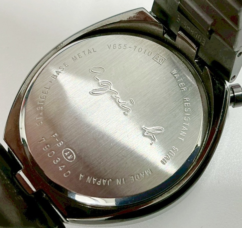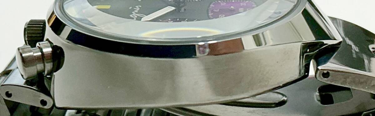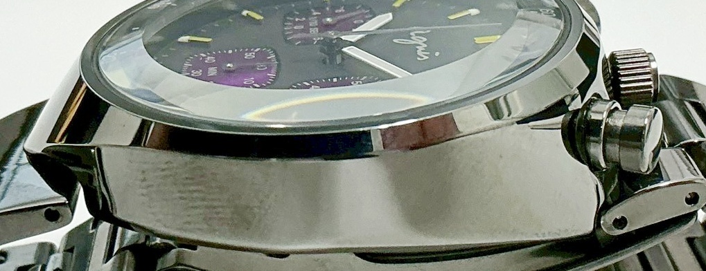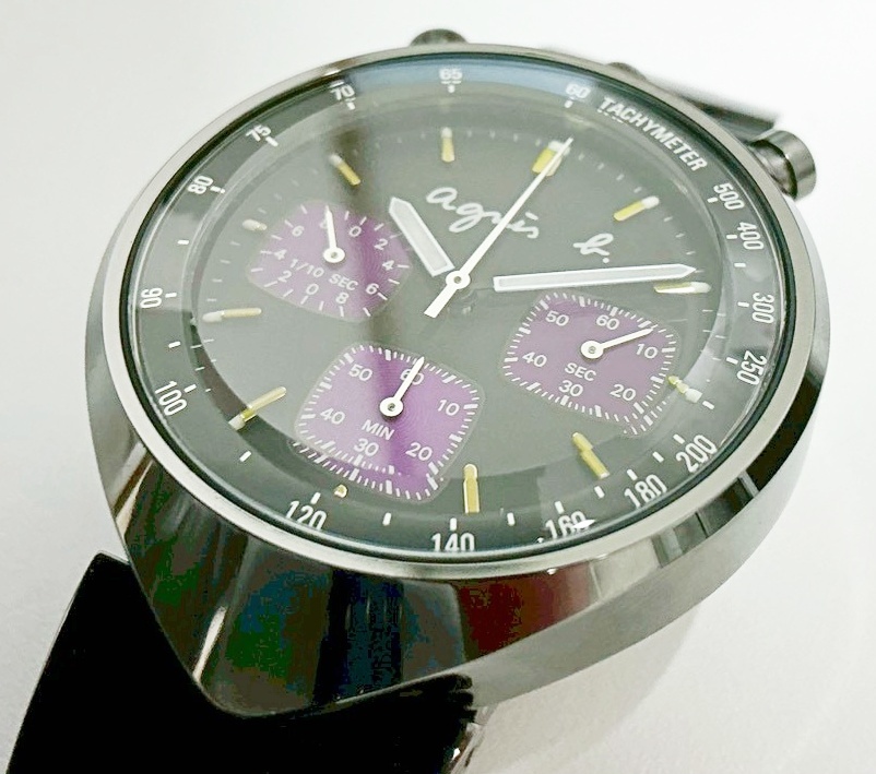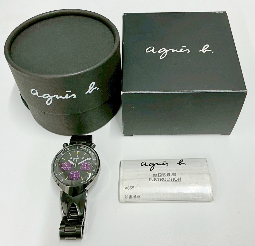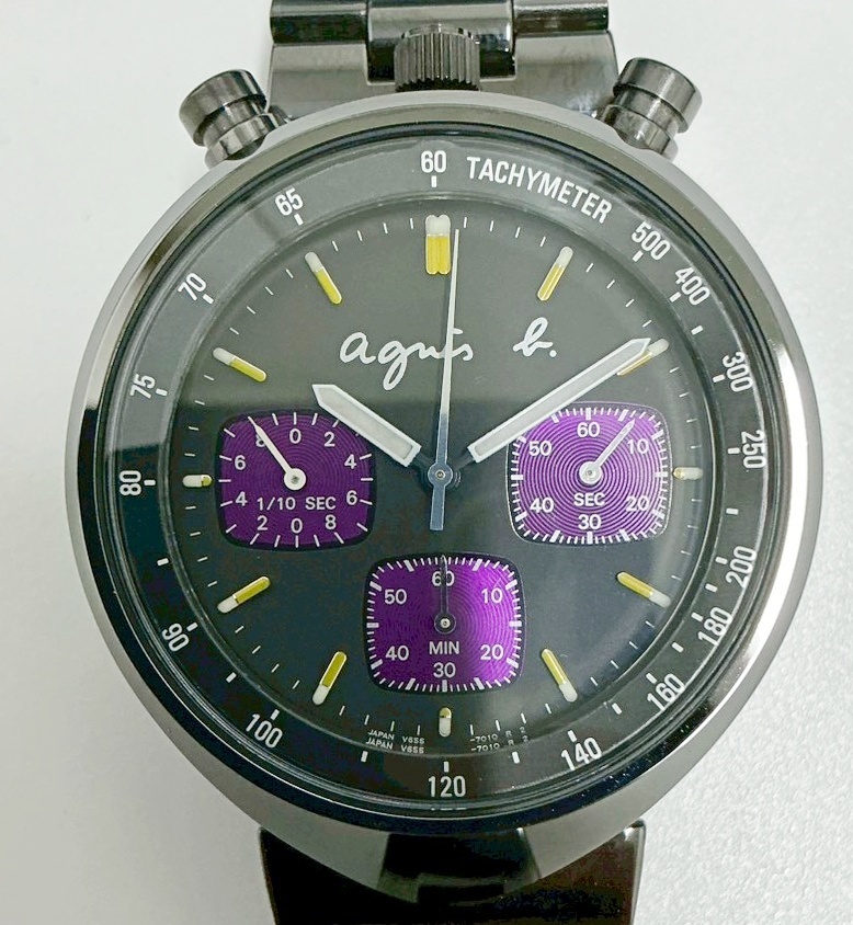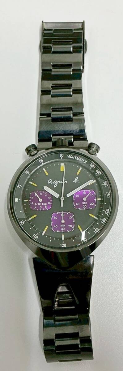1円~ アニエスベー Agnis b. V655-7010 クロノグラフ QZ ブラック×パープル文字盤 メンズ腕時計