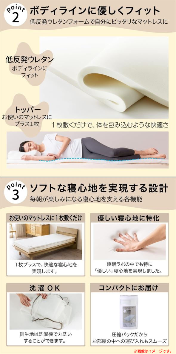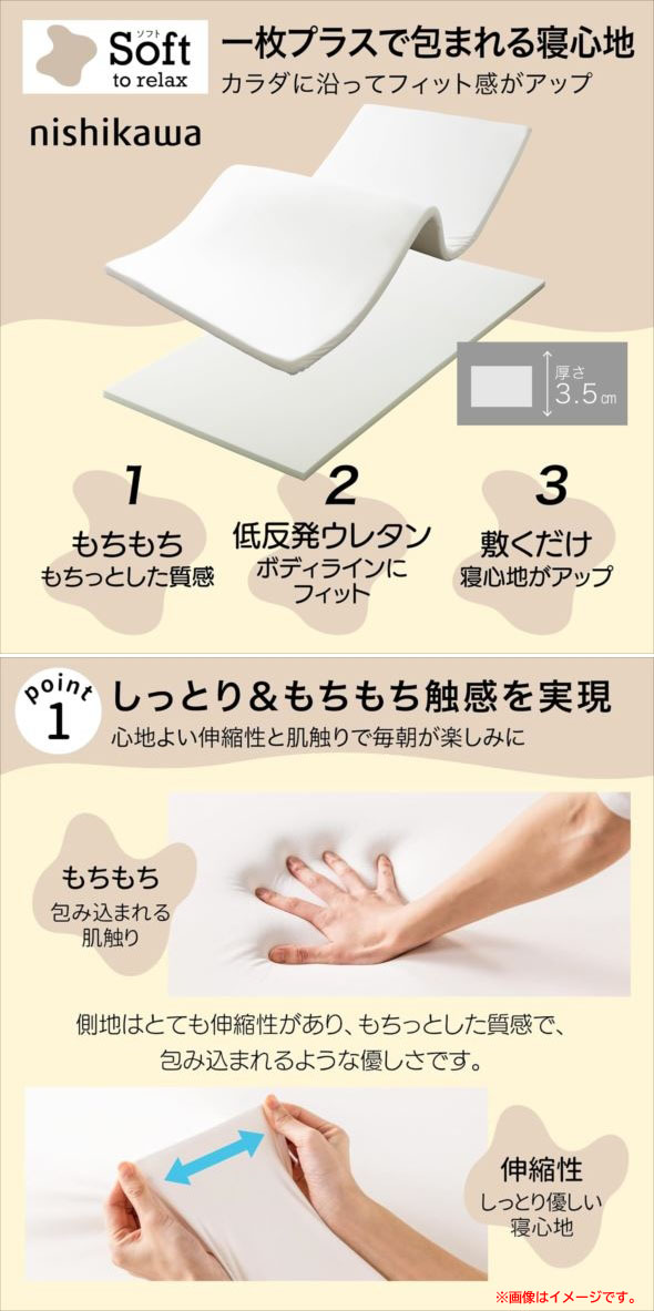 【商品特長】 睡眠科学で寝るだけメンテ。最新の睡眠科学を取り入れた「西川睡眠ラボ」のマットレストッパー。 ◆今お使いのマットレスや敷き布団の上に敷くだけ! 手軽に寝心地が変えられるヘルシーライトマットレス。 ◆しっとり優しくフィットする低反発ウレタンフォームを使用。ソフトな寝心地がお好きな方におすすめです。 ◆側地はとても伸縮性がありもちっとした質感。体を優しく包み込んでくれます。 ◆側地は取り外してお洗濯OK。いつも気持ちよくお使いいただけます。 ◆眠りから健やかさを育む西川の機能性寝具「睡眠ラボ」シリーズ。 疲れた身体や脳を修復できる睡眠のメリットを最大限に利用して明日のコンディションを 積極的に整える人々が増えています。明日の良いパフォーマンスを発揮するために 寝るだけでメンテする、そんな「睡眠ラボ」シリーズで良質な睡眠を。 |