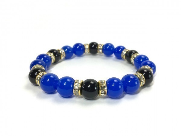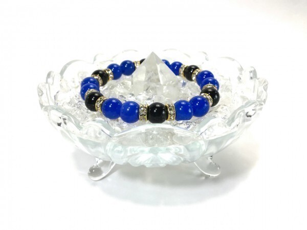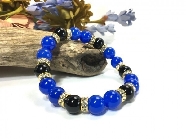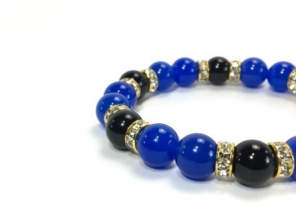 こちらは、ブルーメノウとオニキスを組み合わせたブレスレットです。間にはロンデルを挟み高級感あるデザインに仕上がっています。石大きさは腕にも馴染みやすいように10mm玉で内径約18cm(伸可能)です。数に限りがございますので気になる方はお早めにどうぞ。サイズ調節も可能ですのでサイズ調節の場合は取引ナビにてご一報くださいませ。(サイズ調節無料です)