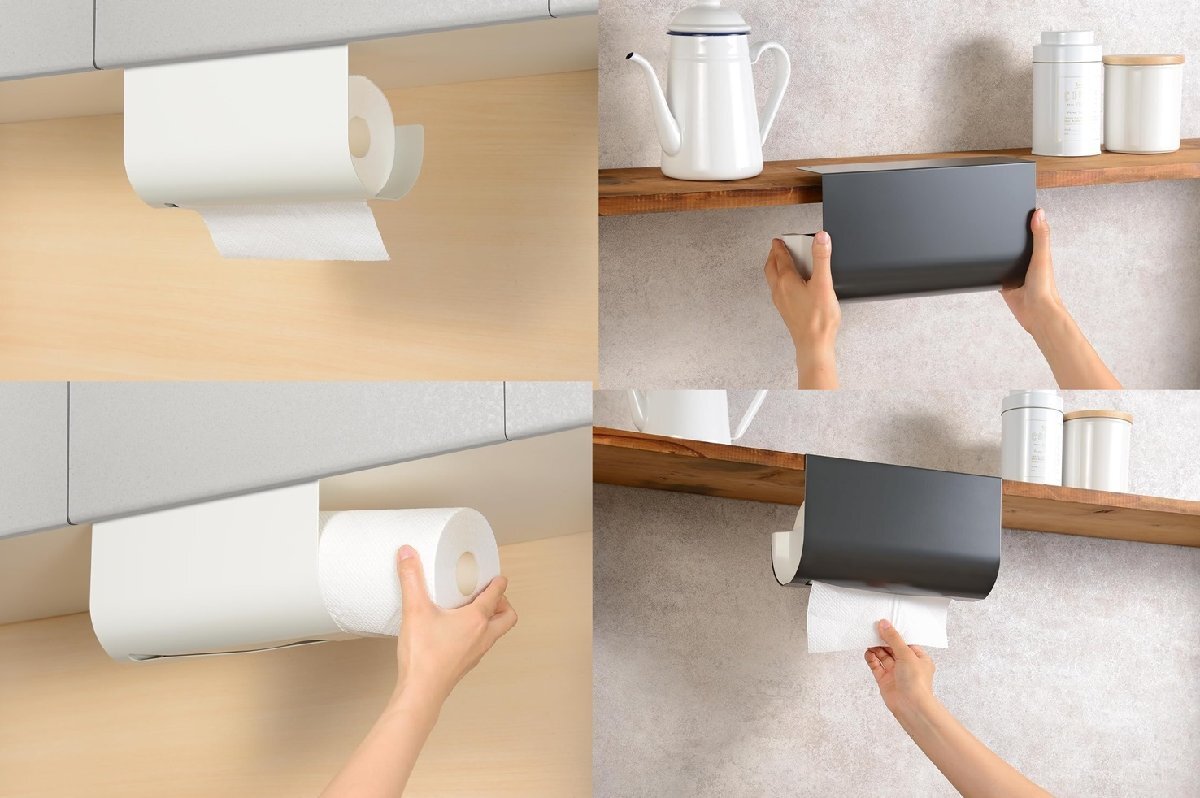 ・キッチンペーパーのロールタイプを簡単に1枚ずつ切ることができます。 ・大判のロールタイプにも対応しています。 ・繰り返し使用できる粘着シート付きだから設置も簡単。左右どちらからでもペーパーを入れることができるので、設置場所を選びません。 ・鋼板なのでレシピやメモ紙をマグネットで貼り付けられます。 |