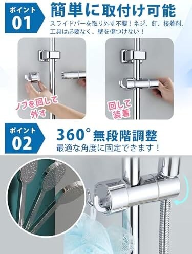 • 『取り外し不要で簡単に取付』SOMOTO 後付けタイプのシャワーフックは、バーを外す必要なく簡単に取り付けられます。ハンドルを軽く回すだけで、直径16mm~25mm(円周約50.3mm~78.5mm)のスライドバーにピッタリ固定されます。工具や穴あけは一切不要で、素人や女性でも簡単に取り付けられます。また、取り外しや向きの変更も容易であり、掃除時にも便利です。簡単な取り付けと使い勝手の良さが特徴で、スライド シャワー フックの取り替えが簡単に行える優れた商品です。『ご注意』ご購入の際は、ご家庭のスライドバーとシャワーホースの直径をご確認ください。スライドバーの直径は16mm~25mm(円周約50.3mm~78.5mm)に適しています。シャワーホースの直径が15mm以下の場合に適しています。また、ご自宅のシャワーヘッドとよく照らし合わせてください。シャワーヘッド挿入部の穴のサイズは、上部が約φ23.5mm、下部が約φ21mmです。