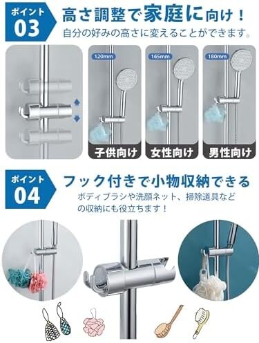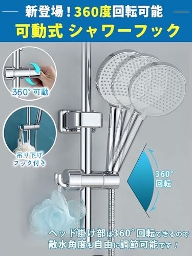 『シャワーヘッドの高さ・角度調節に便利』スライドバー用シャワーフックは、シャワーヘッドが360°の角度調整が可能で、使い手の好みに合わせて適切なシャワー角度に簡単に調整できます。立って使う人も座って使う人も、そのたびにシャワーフックを高い位置から低い位置に移動させることができ、その操作はシリコンパッドのデザインにより軽やかでスムーズです。柔らかいシリコンパッドが採用されており、バーに傷をつけずにキラキラと美しい光沢を保ちます。さらに、シャワーヘッド掛け部は360°回転可能で、散水角度も自由に調節できます。