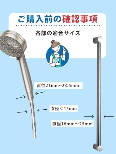 『自信を持って一年間保証』『ご注意』ご購入の際は、ご家庭のスライドバーとシャワーホースの直径をご確認ください。スライドバーの直径は16mm~25mm(円周約50.3mm~78.5mm)に適しています。シャワーホースの直径が15mm以下の場合に適しています。また、ご自宅のシャワーヘッドとよく照らし合わせてください。シャワーヘッド挿入部の穴のサイズは、上部が約φ23.5mm、下部が約φ21mmです。SOMOTOは正式に商標権を取得しております(商標登録番号6564376)。独立した生産工場を持ち、すべてのシャワーフックは出荷前に全品検査され、品質が保証されています。製品に絶対の自信を持っているため、1年間の保証を提供しています。ご使用中に何か問題がある場合はいつでもお問い合わせください。