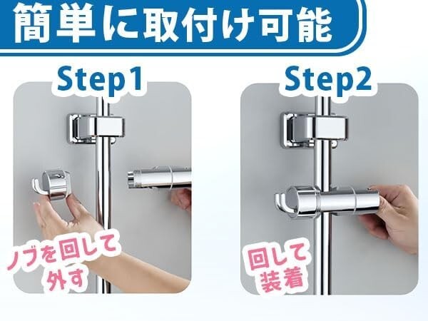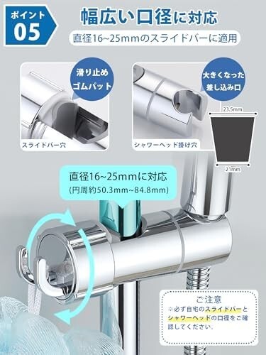 『安定したシャワーヘッド取り付け』スライド シャワー フック部はネジで締めつけトルクを調整でき、締めつけ強度を調整することで、シャワー フックを軽く回転させつつ、シャワーヘッドの脱落を防止します。また、シャワーヘッド フックは直径16mm~25mm(円周約50.3mm~78.5mm)のスライドバーに対応しており、分割構造によりスライドバーを分解することなく取り付けられます。シャワーヘッド挿入部の穴のサイズも拡大され、上部の径は約φ23.5mm、下部の径は約φ21mmです。【※15mm以下のシャワーホースに適しています。】
