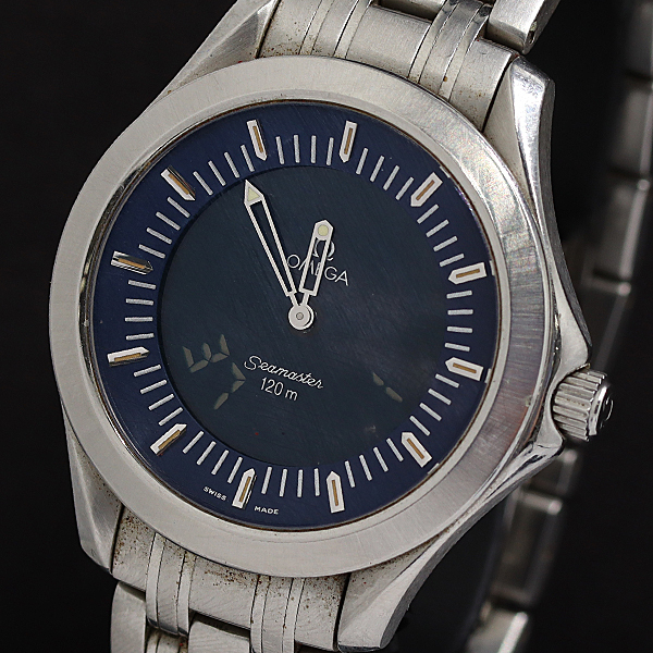 1円 保付 稼働 オメガ シーマスター120マルチファンクション 2521.81 55558366 QZ ブルー/デジタル文字盤 メンズ腕時計 5890500 9KHT MST