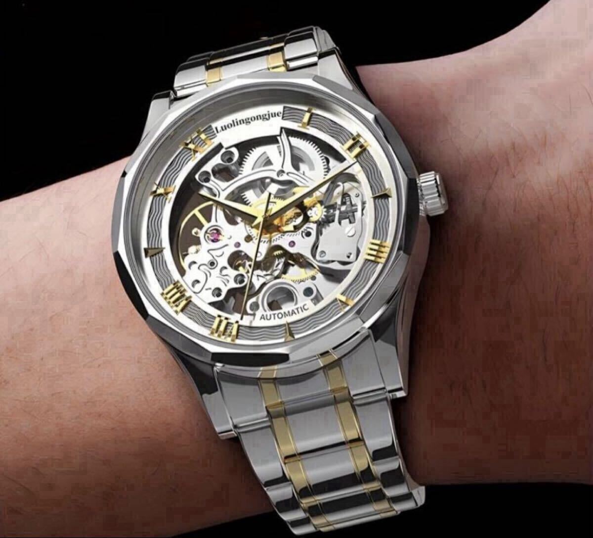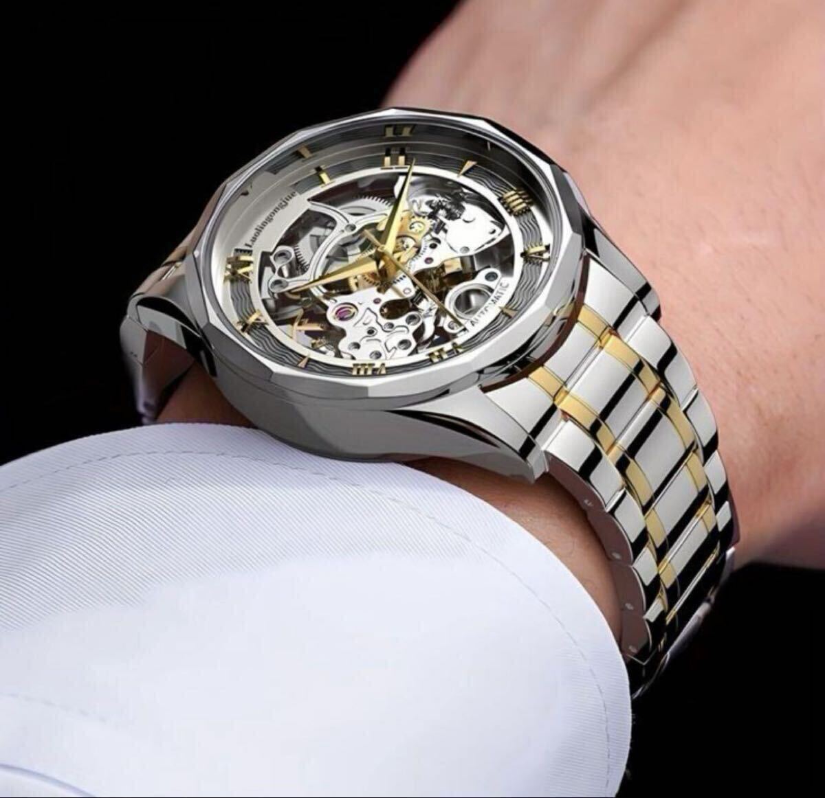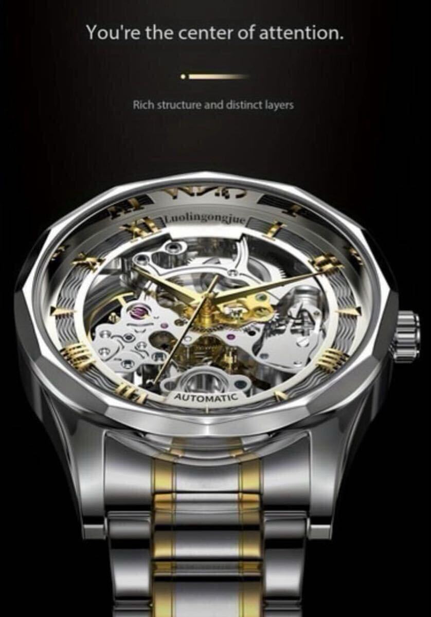 スケルトンデザインの自動巻き時計、シルバーとゴールドのコンビネーション。