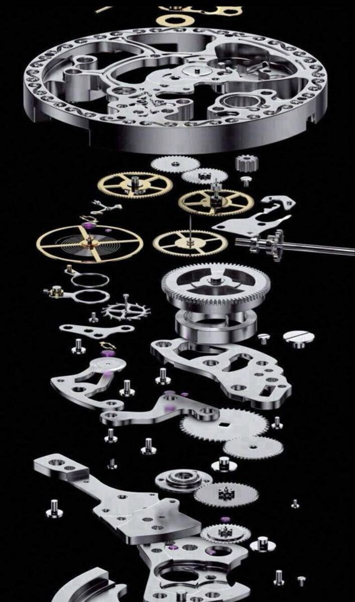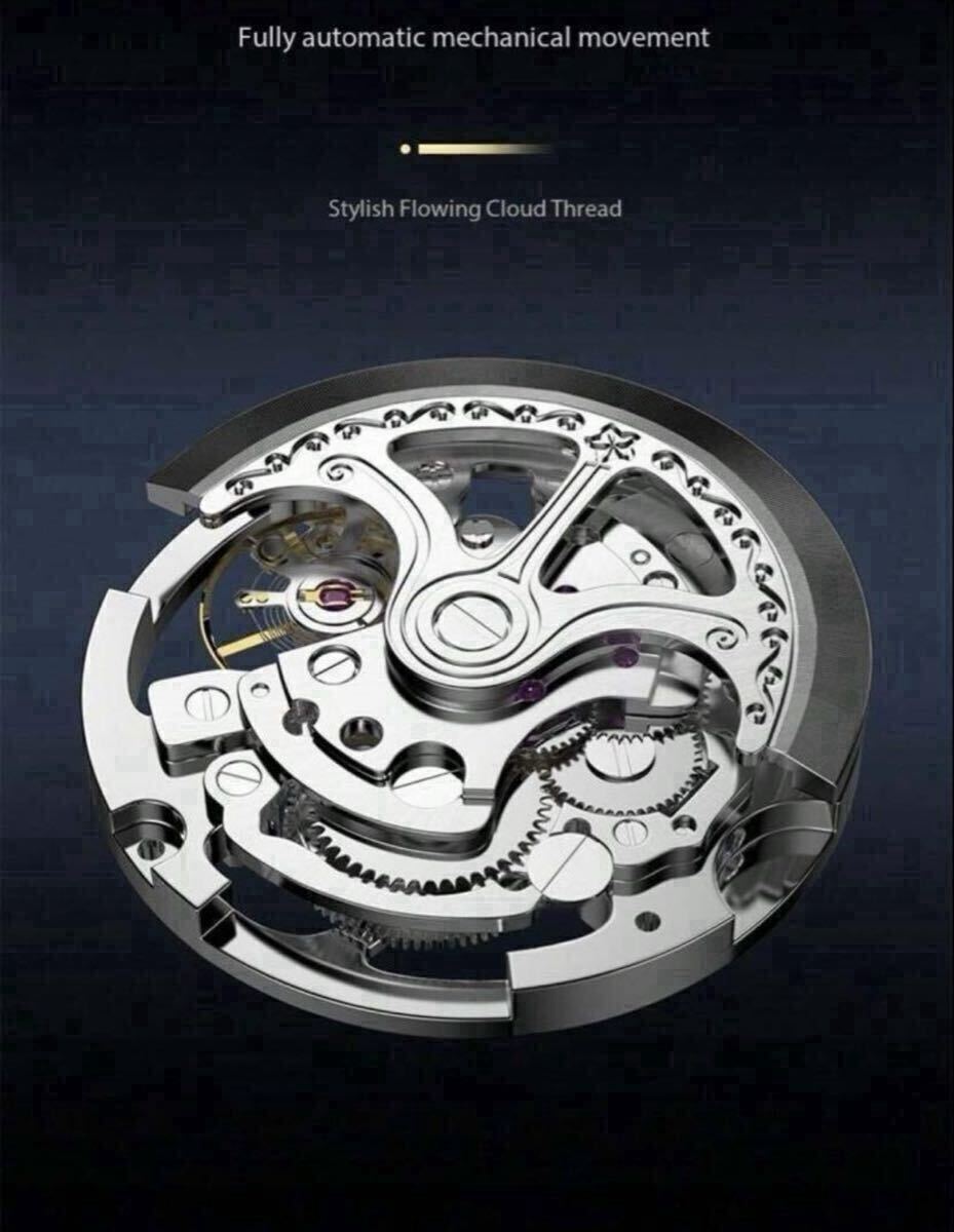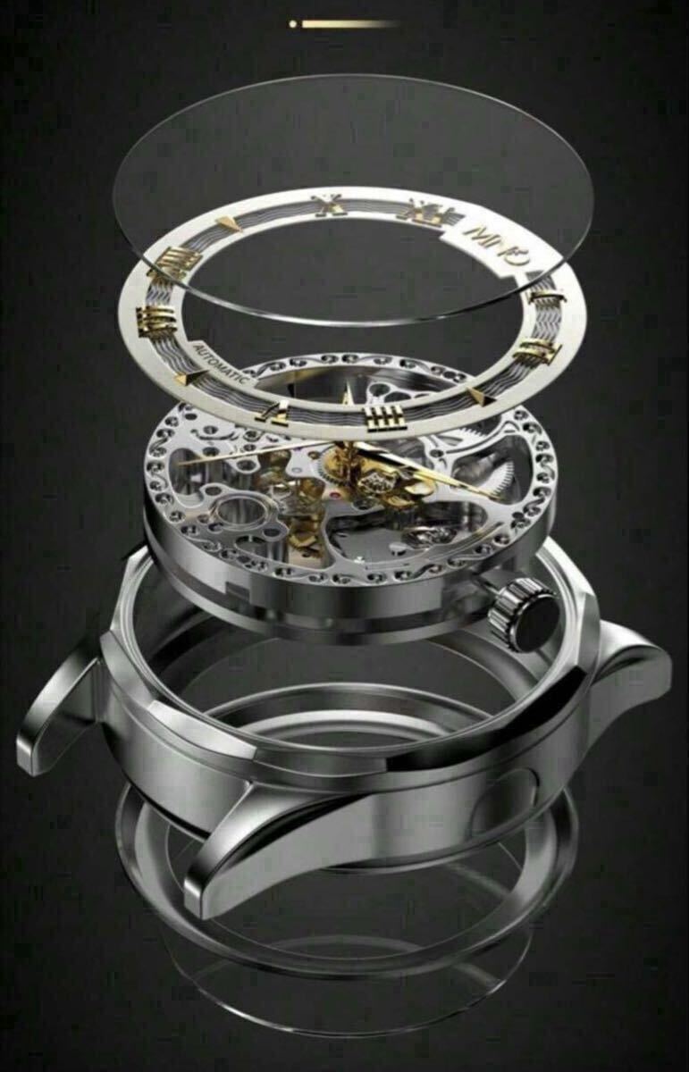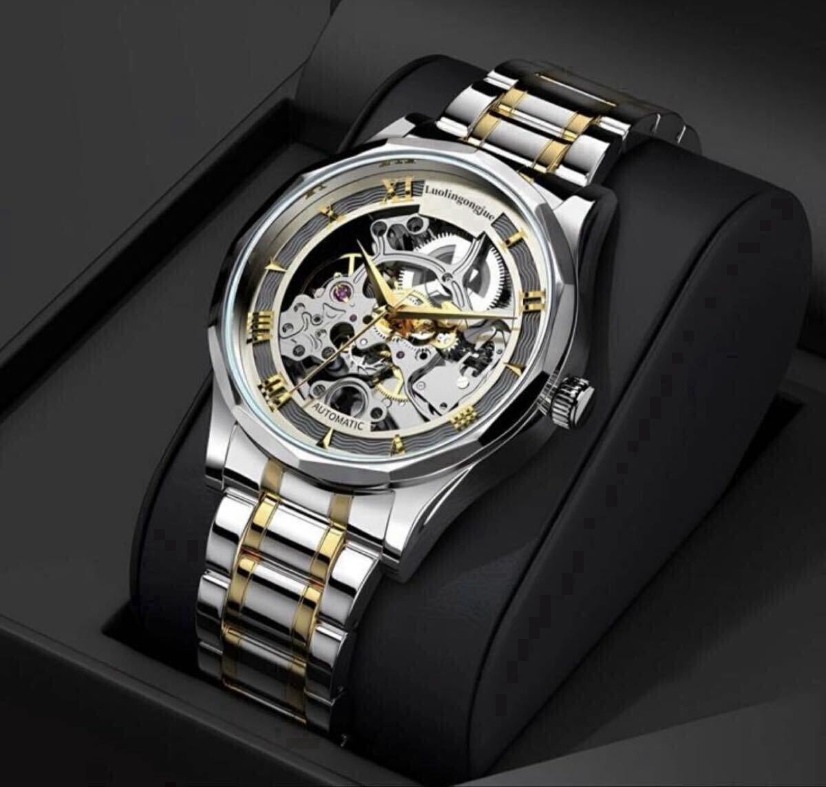 スケルトンデザインの自動巻き時計、シルバーとゴールドのコンビネーション。
