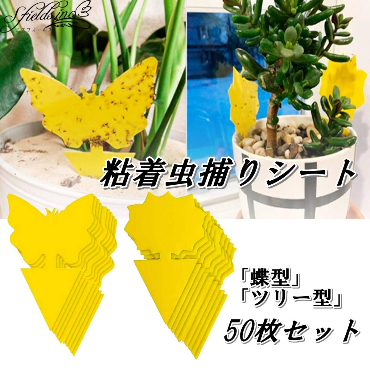 殺虫剤、除虫剤などを使用しない、植物に優しい粘着虫捕りシート50枚セットです。「蝶型」と「ツリー型」の2種類からお選びいただけます。