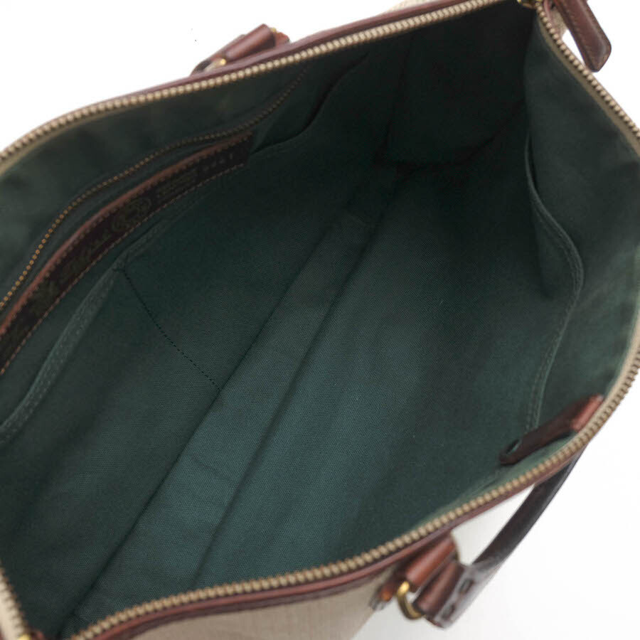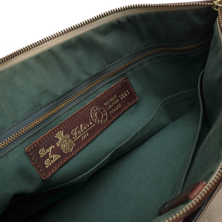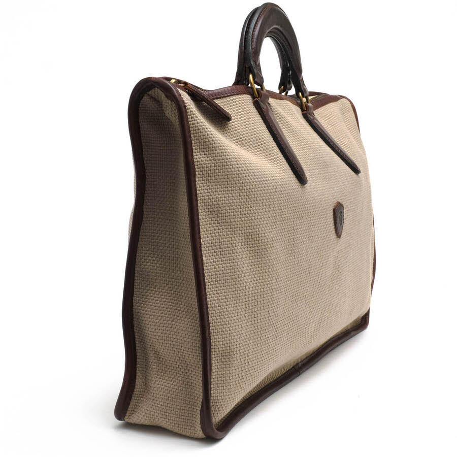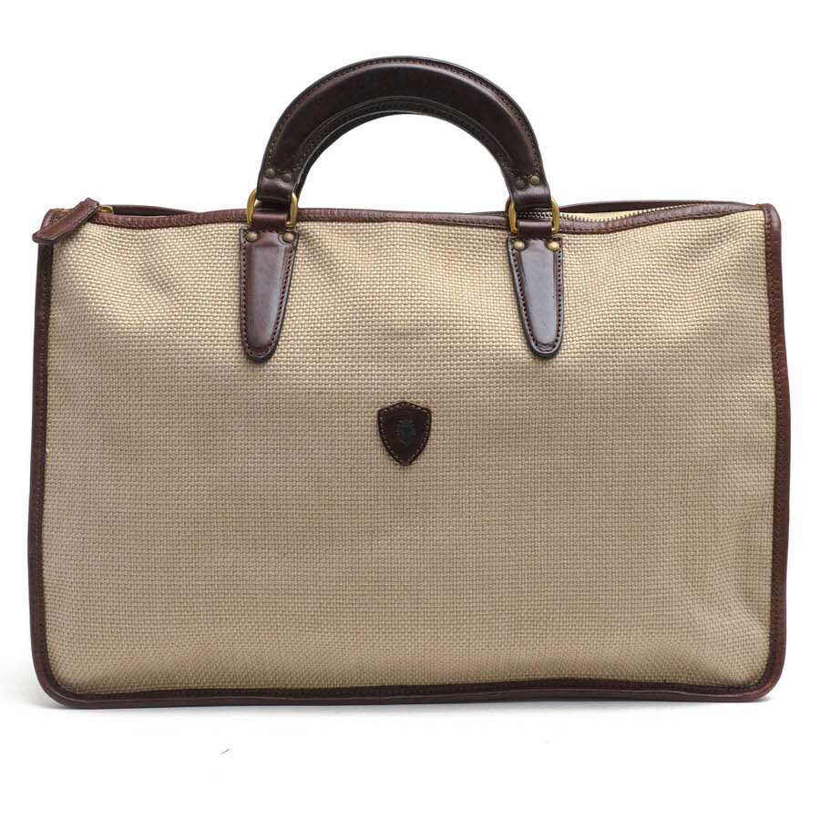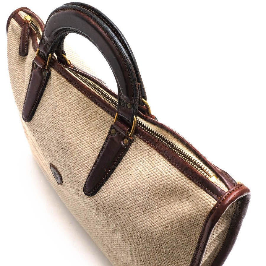 フェリージのブリーフケース「9841」。太織仕立てのキャンバス地を使っているのが特徴で、とても温かい雰囲気が魅力です。フラットなデザインのレザーハンドルに、バッグ正面にはフェリージの紋章が配置されていて、シンプルなデザインながら、フェリージらしい高級感を感じさせます。収納力も抜群ですが、ジップ開閉式で、荷物が見えず安心です。 |