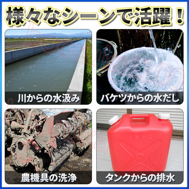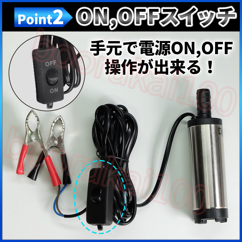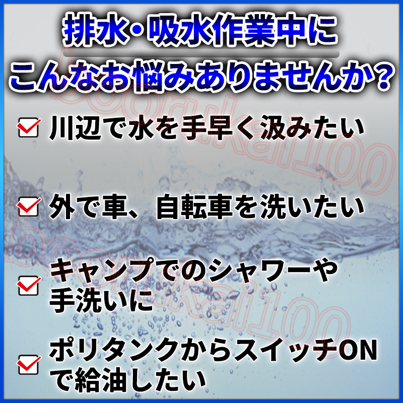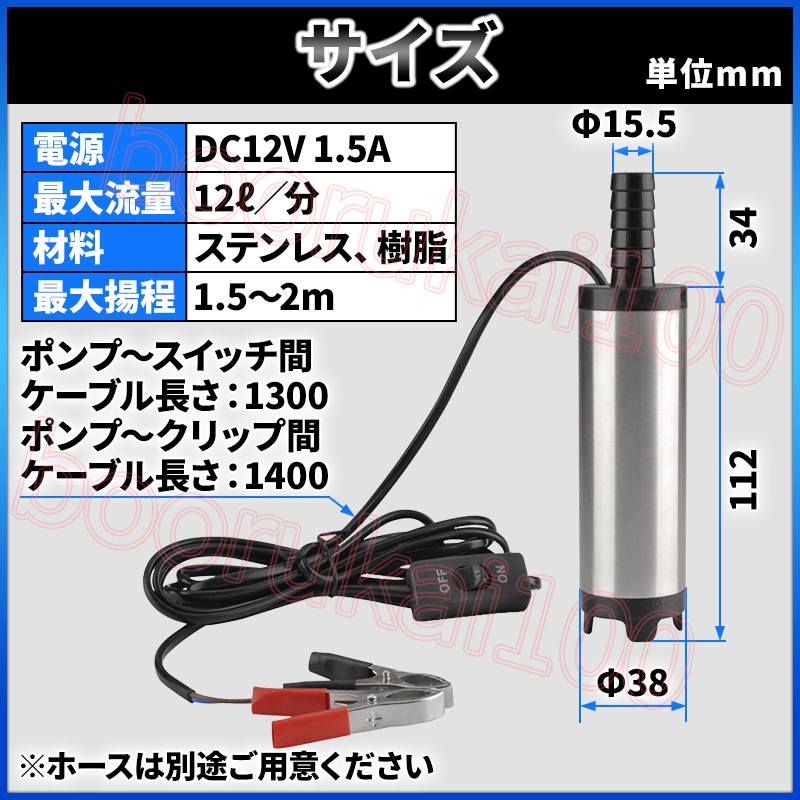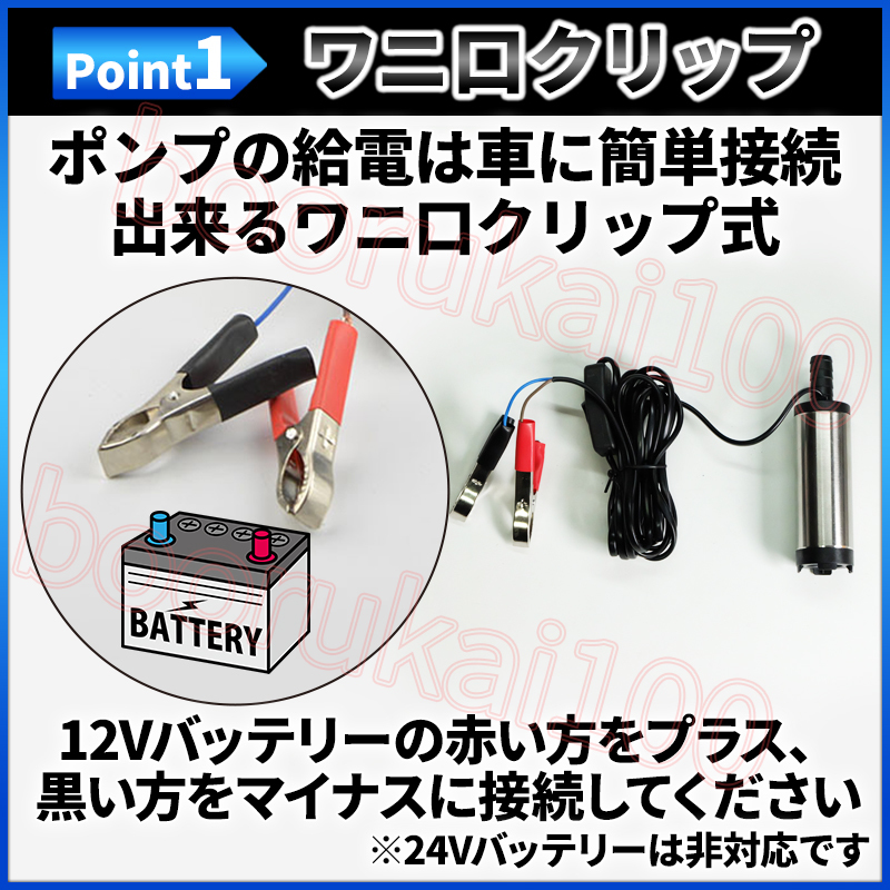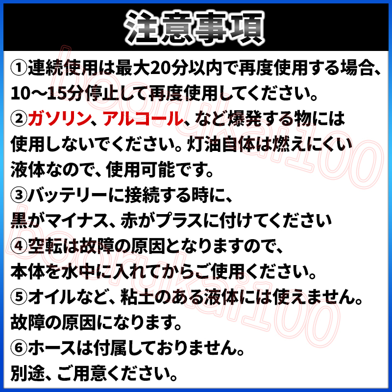 商品説明 | ご覧頂きまして、誠にありがとうございます(^^) 持運びに便利なコンパクト設計 給水、排水、循環が出来るポンプなので、 川や農業用水路から水を吸い出し、泥汚れを落としたり 軽トラックの荷台に乗せた、灯油が入っているポリタンクから給油する事が出来ます。 電動ポンプ 商品情報 ―――――――――――――― サイズ:全長 約 146mm × ポンプ直径 約 Φ38mm 電源:DC 12V 1.5A 起動:スイッチ ON OFF 式 ケーブル長:全長2.7m 最大流量:12L/min 最大揚程:1~2m 吐出口径:Φ15.5mm (ウォーターポンプにはホースの穴内径Φ15mmの物を別途ご用意ください) 小さいながら、パワフルな吸い上げ! 自動車、バイク、船や農機具に12Vのバッテリーを積んでいる 物があればそこから電源を取り出す事が出来る、 ワニ口クリップ式です。 以下のようなシーンで活躍いたします! ・小型船舶の洗浄 ・海水の汲上 ・農機具や野菜等の洗浄、泥、土落とし ・漁網、釣り具の洗浄 ・キャンプ・レジャー時の手洗い、シャワー ・マウンテンバイク、オフロードバイク、ジェットスキー、水上バイクの洗浄 【 取付け方法 】 ①ポンプの電源OFFにする ②赤色(プラス極)のクリップをプラスのバッテリーに接続する ③黒色(マイナス極)のクリップをマイナスのバッテリーに接続する 【 取外し方法 】 ①ポンプの電源OFFにする ②黒色(マイナス極)のクリップを外す ③赤色(プラス極)のクリップを外す ステンレス製なので、湖水や海水などでも錆びにくく、耐久性も抜群です! ※ 注意 ※ ・濡れた手で、電源スイッチ、ワニ口クリップを触らないようにしてください。 ・ハイブリット車、EV車からの給電はオススメしません。 12Vバッテリーからの給電をしてください。 他の商品との同梱もいたしますのでその際にはご連絡ください。 |
