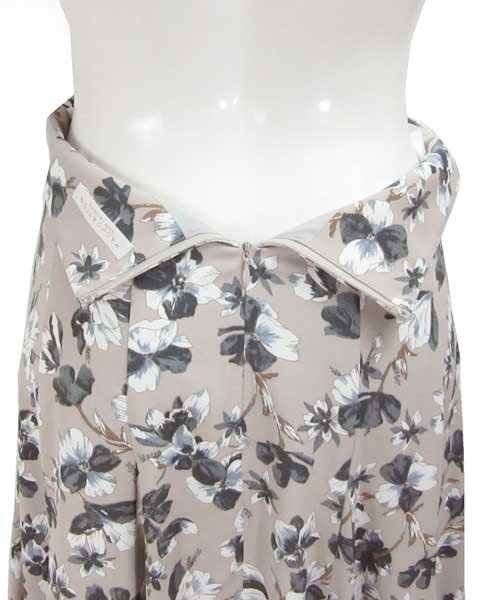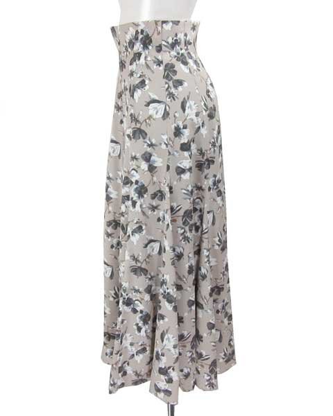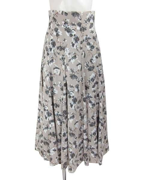 ハイウエストデザインの上品なロングスカート。落ち着きのあるグレージュにシックなお花柄デザイン。生地が多めのフレアースカート。ビジネスシーンからオフの日までお使い頂けます。 |