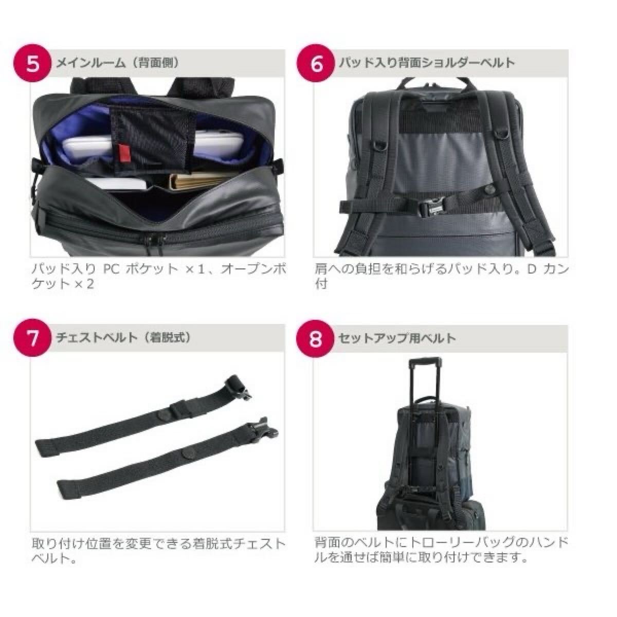 本体に軽量樹脂フレームを内蔵し、型崩れしにくく、自立しやすい仕様。本体前面に2種類の生地を使用したコンビネーションデザイン。特殊コーティングにより撥水性、耐水性に優れたバッグです。チェストベルトの取り外しができ、ショルダーベルトへの取り付け位置を3段階で調整できます。