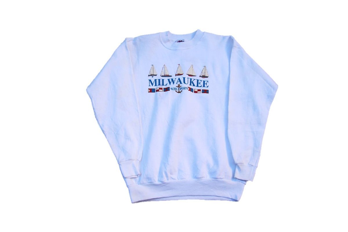 1990年代頃のAdin製長袖スウェットシャツとなります。メキシコ製のボディが使用されており、プリントはフロントのみでWisconsin州にある街Milwaukeeの文字が入る事から恐らく街のお土産品等で販売されていた物かと思われます。サイズはMでホワイトボディ、素材はコットンとポリエスターの混紡素材となります。古着らしいプリントなので、お好きな方は是非ご検討下さい。