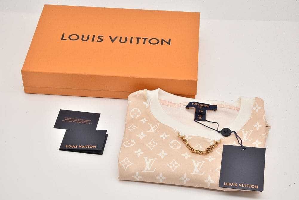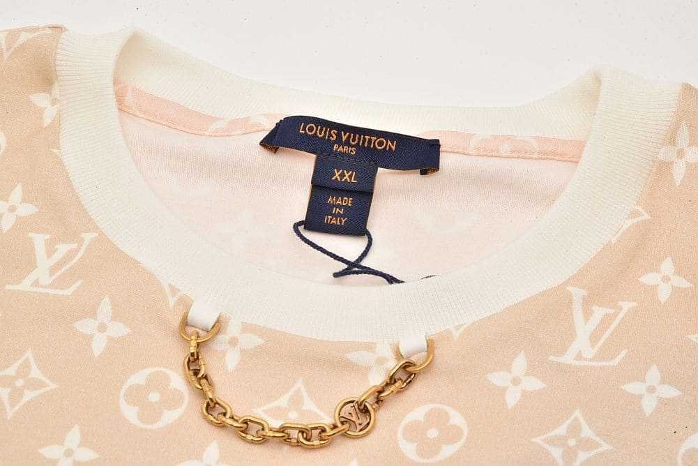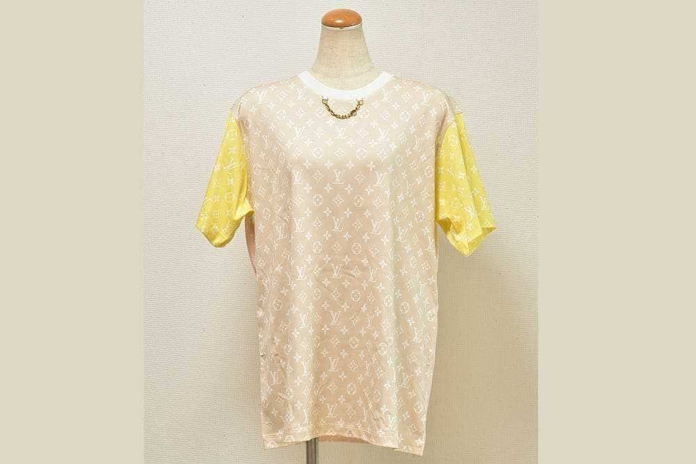 商品説明 | 3色のモノグラム・パターンでデザインされたTシャツに首元のLVチェーンがアクセントのTシャツでございます。 |