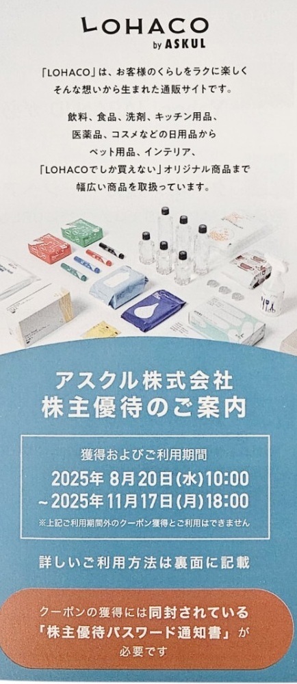 アスクル 株主優待券 株主優待クーポン LOHACO 2000円分