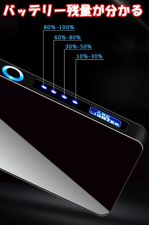 【充電式 バッテリー残量が分かる充電式ライターです】形がシンプルできれいでおしゃれです。充電式なので経済的です。バッテリー量も表示されるので充電のタイミングも分かりやすいです。今までも他の充電式の物を使っていたのですが、突然無くなってて使いたい時に使えない時があり。充電切れを防げるのはとても良いと思います。電源スイッチを入れてる間はバッテリー残量を示す。