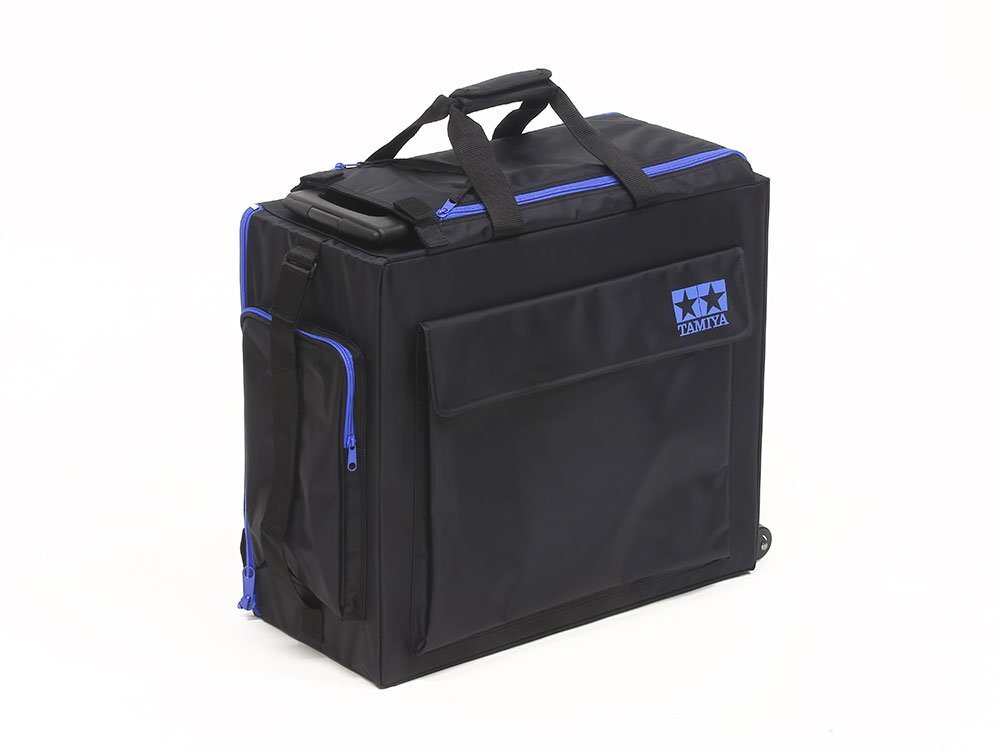 【 ホイール付きで移動も楽々 】 RCマシンと工具などを持ち運ぶのに便利なキャスターホイール付きのピットバッグです。内部にダンボール製の収納ボックス(大1個、小4個)を用意。大にはツーリングカーなどの車両、小には充電器や各種パーツなどの小物が収納できます。また天面は工具入れとして使え、背面にはセッティングボードなどを入れるスペースも設けました。ブラックをベースに、ファスナーやタミヤロゴをブルーで配したハイセンスな仕上がりです。11種類のタミヤマークを配置した「タミヤロゴステッカー」付き。トローリーハンドルは伸縮可能。
