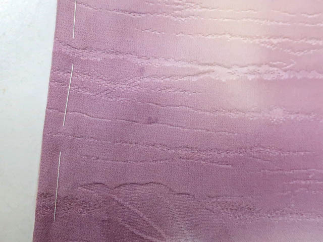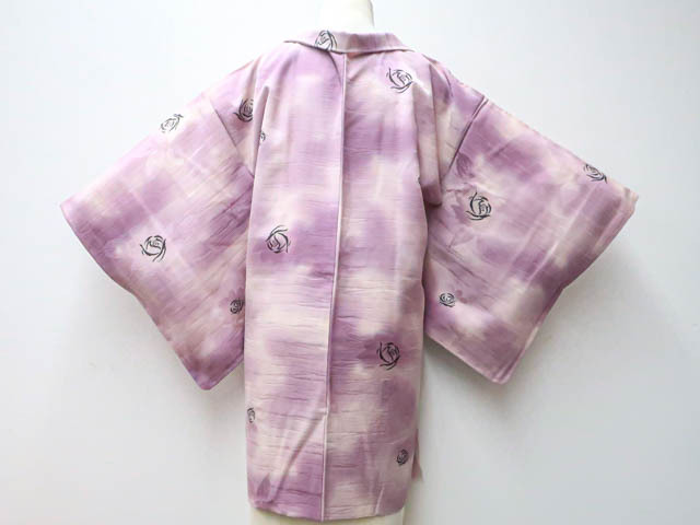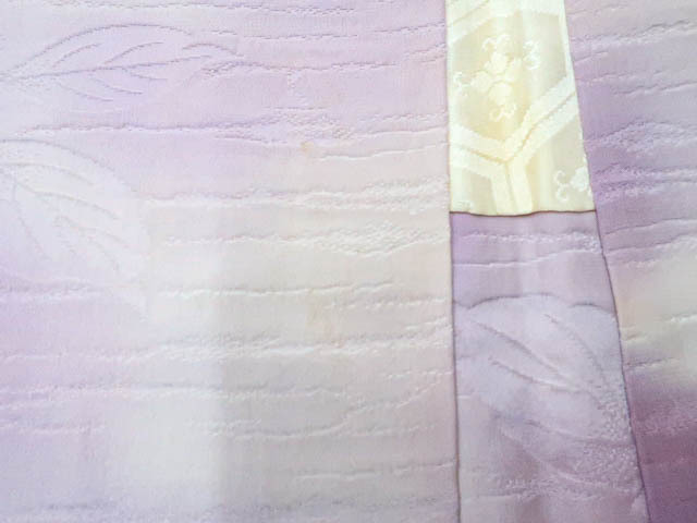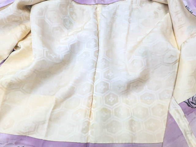 リサイクル商品のため、羽裏と裾返りに薄しみと左後袖に小さなしみがございますが着用可能なお品です。 地色は 紫です。 1枚目の画像が近いお色かと思われます。 素材は正絹です。 |