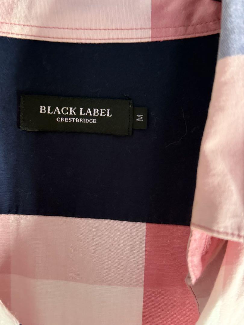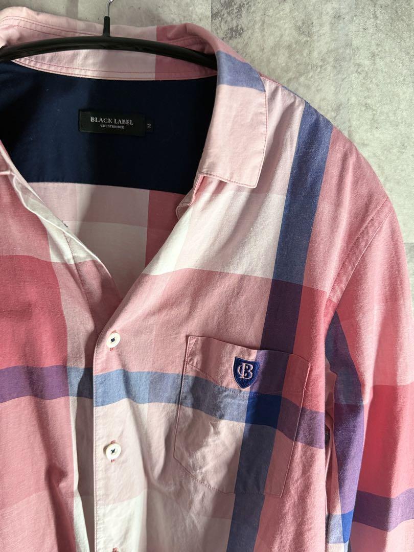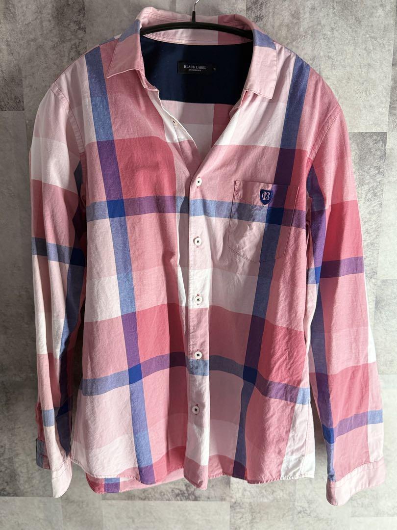 ピンクとブルーのチェック柄の長袖シャツ、胸ポケット付きでカジュアルに最適。