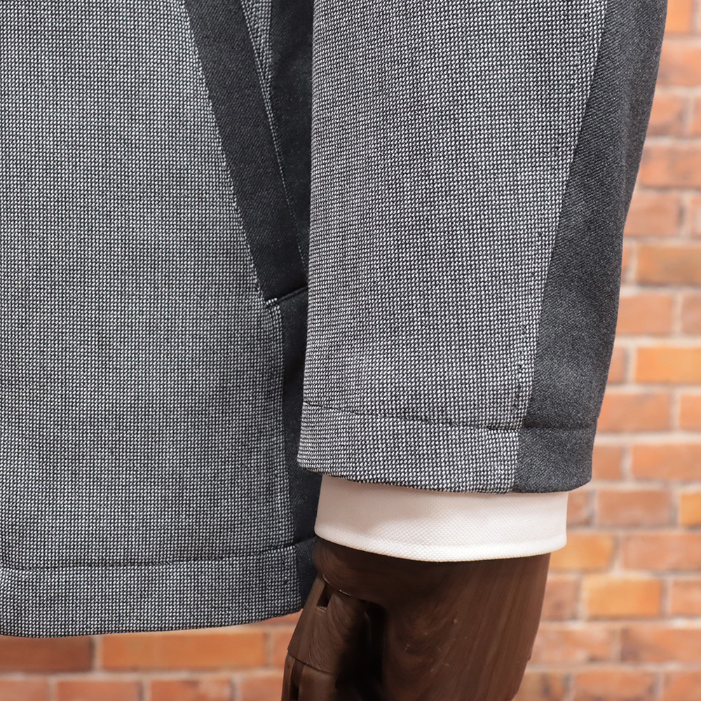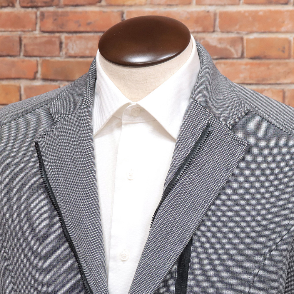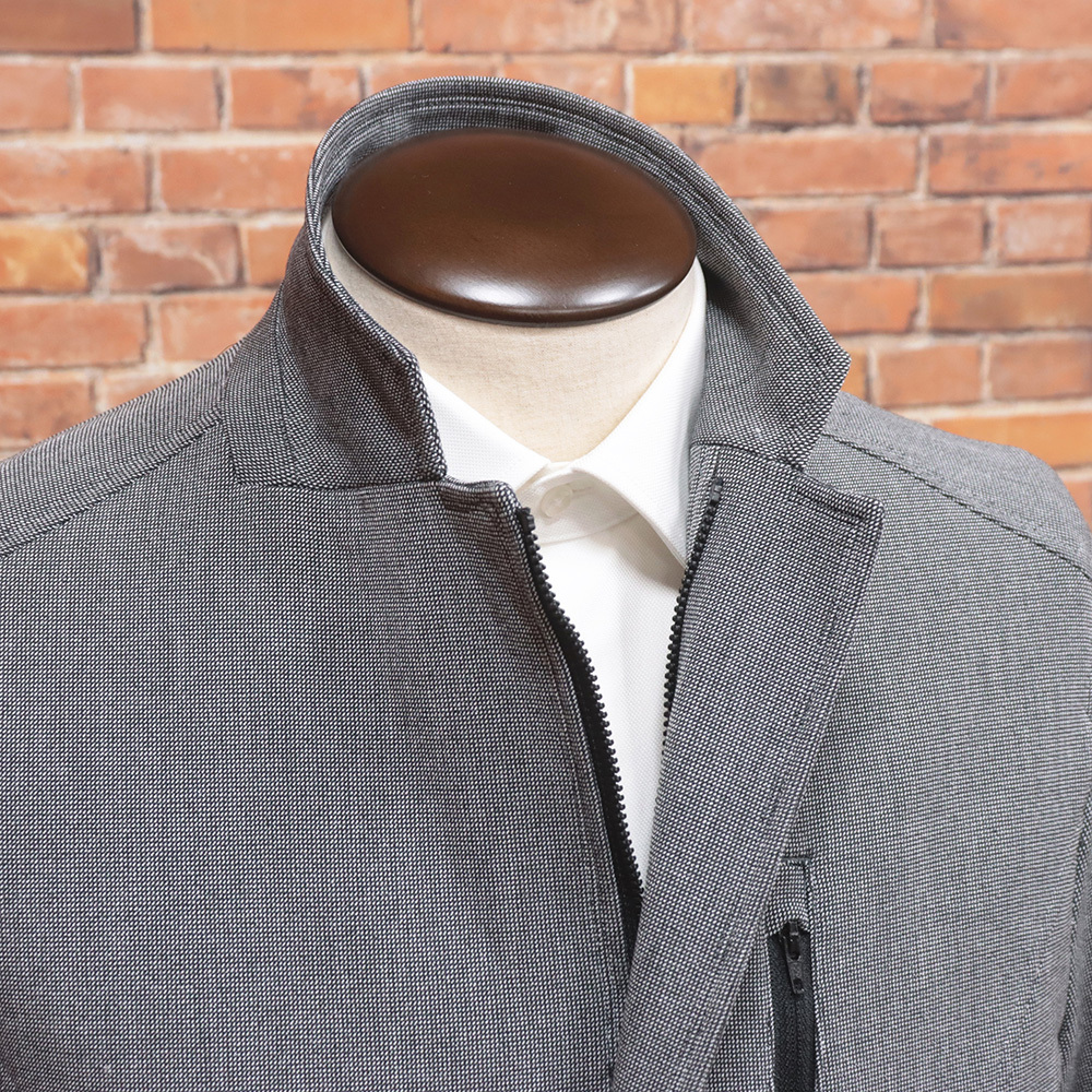 ファスナー付きのフロントデザインと異素材切替が目を引く、コンバーチブル仕様の2WAYジャケット。テーラードとしてはもちろん、上まで閉めてブルゾン風にも着用できる、着こなしの幅が広がる一着です。