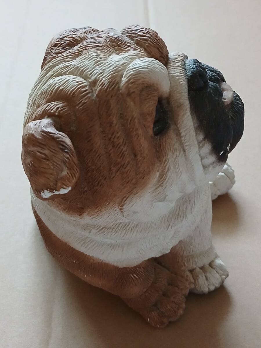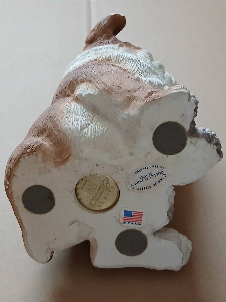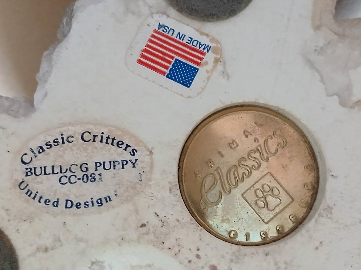 Classic Critters BULLDOG PUPPY CC-081 United Design です。画像に写るものが全てです。今から約36年前、アメリカを訪れたときに現地で購入した石製の置物です。大きさは、約H15×13×13cmです。重量は1402gです。10年ほど室内で飾っていましたが、その後屋根裏部屋に長く眠っていました。色が一部はげたり、ほこりがついたり等していますが、愛くるしい表情の品です。以上をご理解の上、ご入札ください。