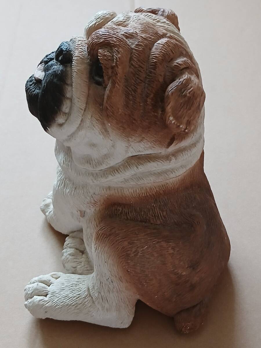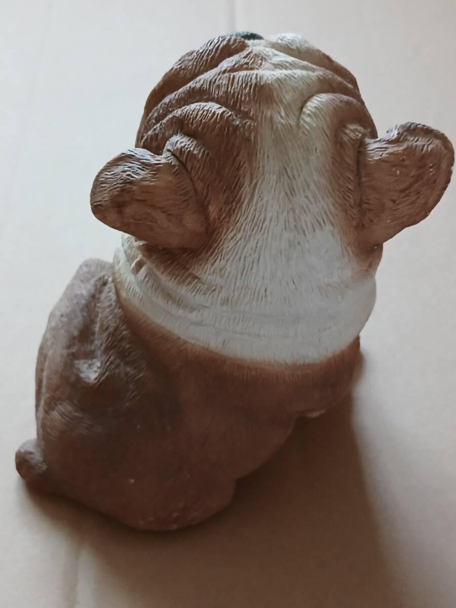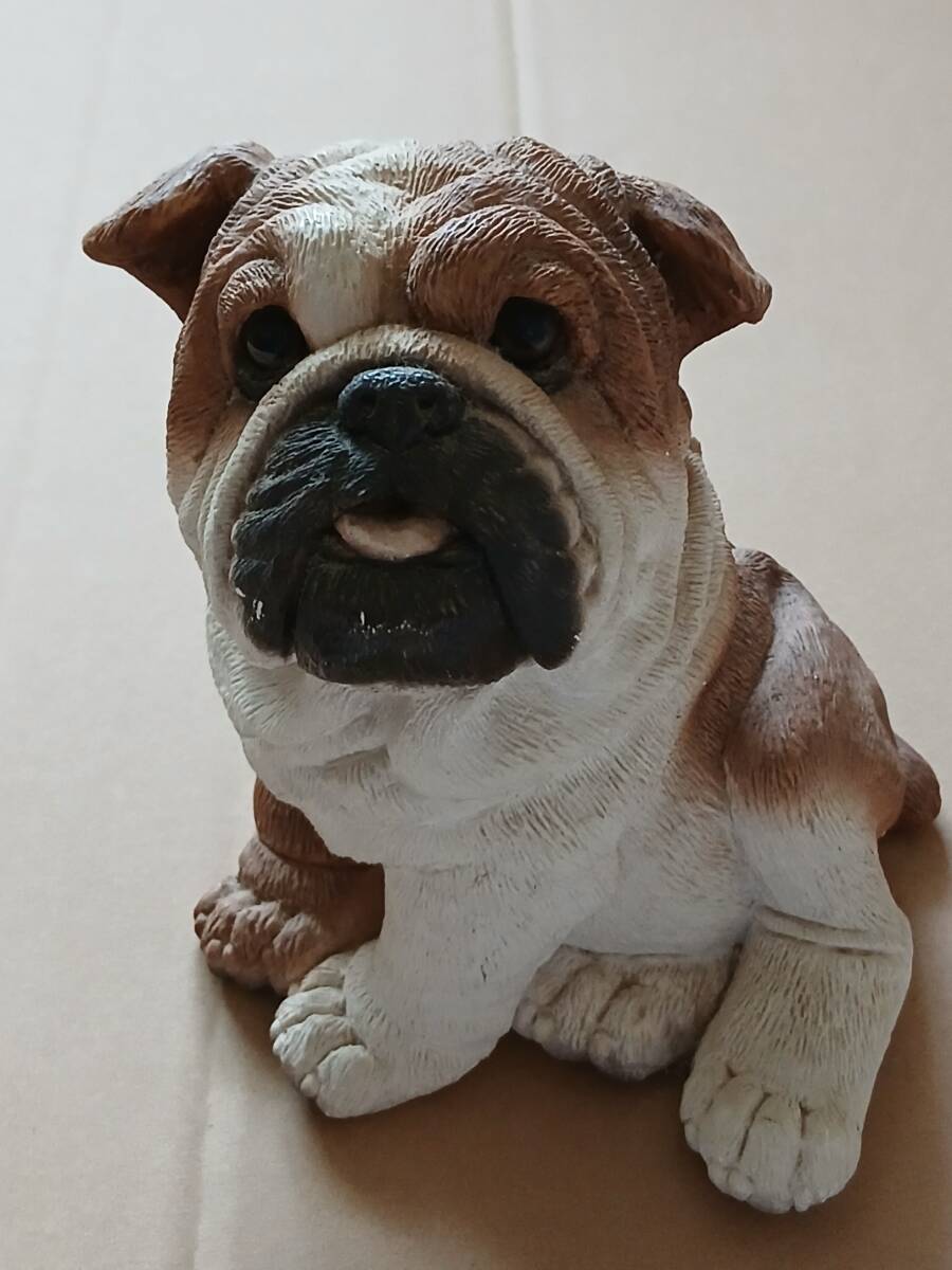Classic Critters BULLDOG PUPPY CC-081 United Design です。画像に写るものが全てです。今から約36年前、アメリカを訪れたときに現地で購入した石製の置物です。大きさは、約H15×13×13cmです。重量は1402gです。10年ほど室内で飾っていましたが、その後屋根裏部屋に長く眠っていました。色が一部はげたり、ほこりがついたり等していますが、愛くるしい表情の品です。以上をご理解の上、ご入札ください。