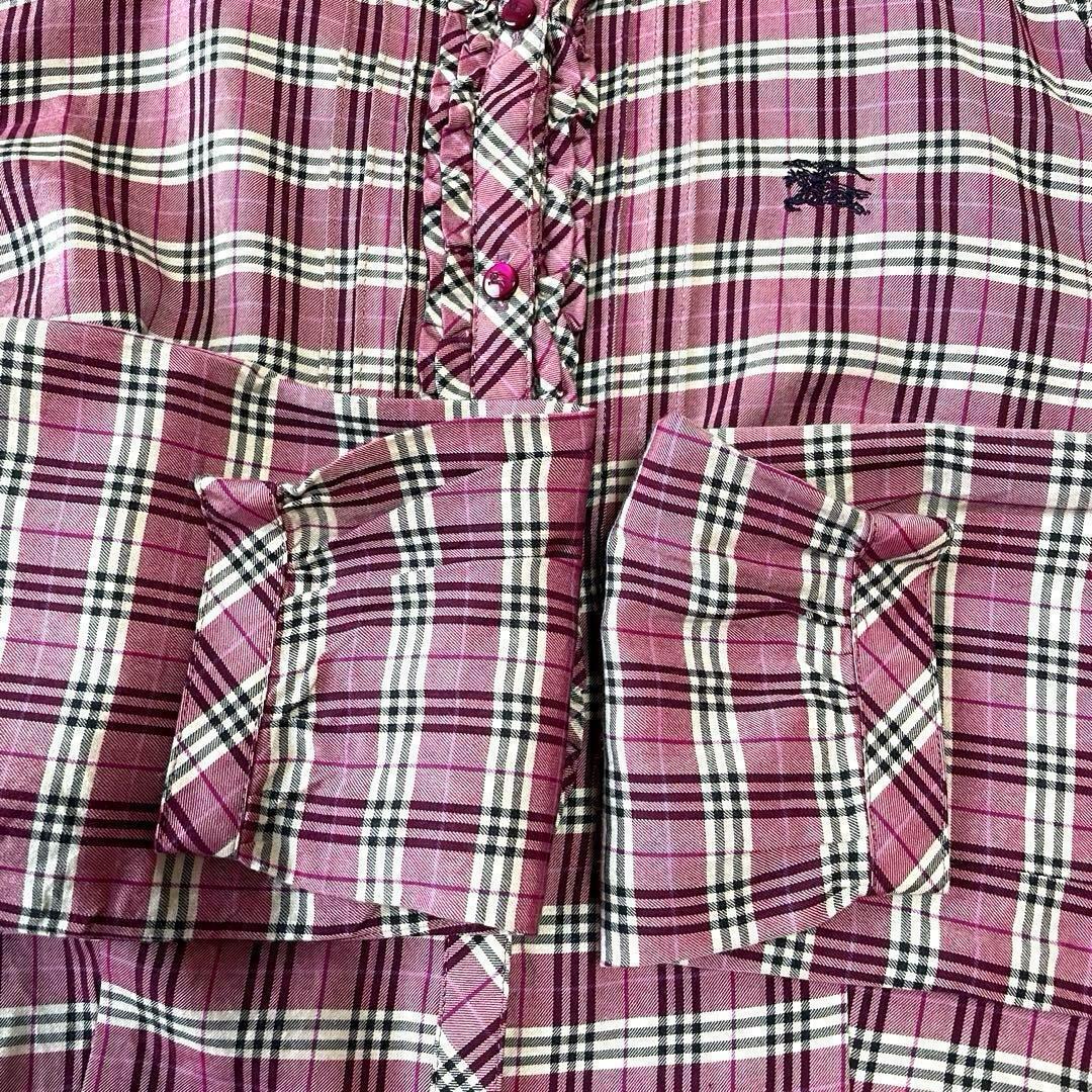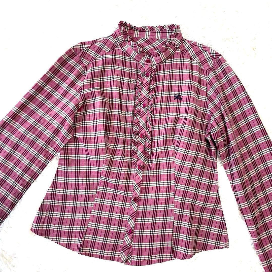 少しくすみががった大人ピンクのノバチェック柄にボタンラインやお顔まわりにフリルを施した素敵なシャツ ブラウスです。ストレートではなく、ウエストで少し絞った形のお品です。