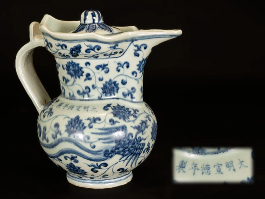●中国 大明宣徳年製 款 青花花唐草鳳凰文 僧帽壺 水注 中国美術●