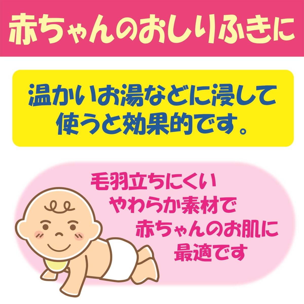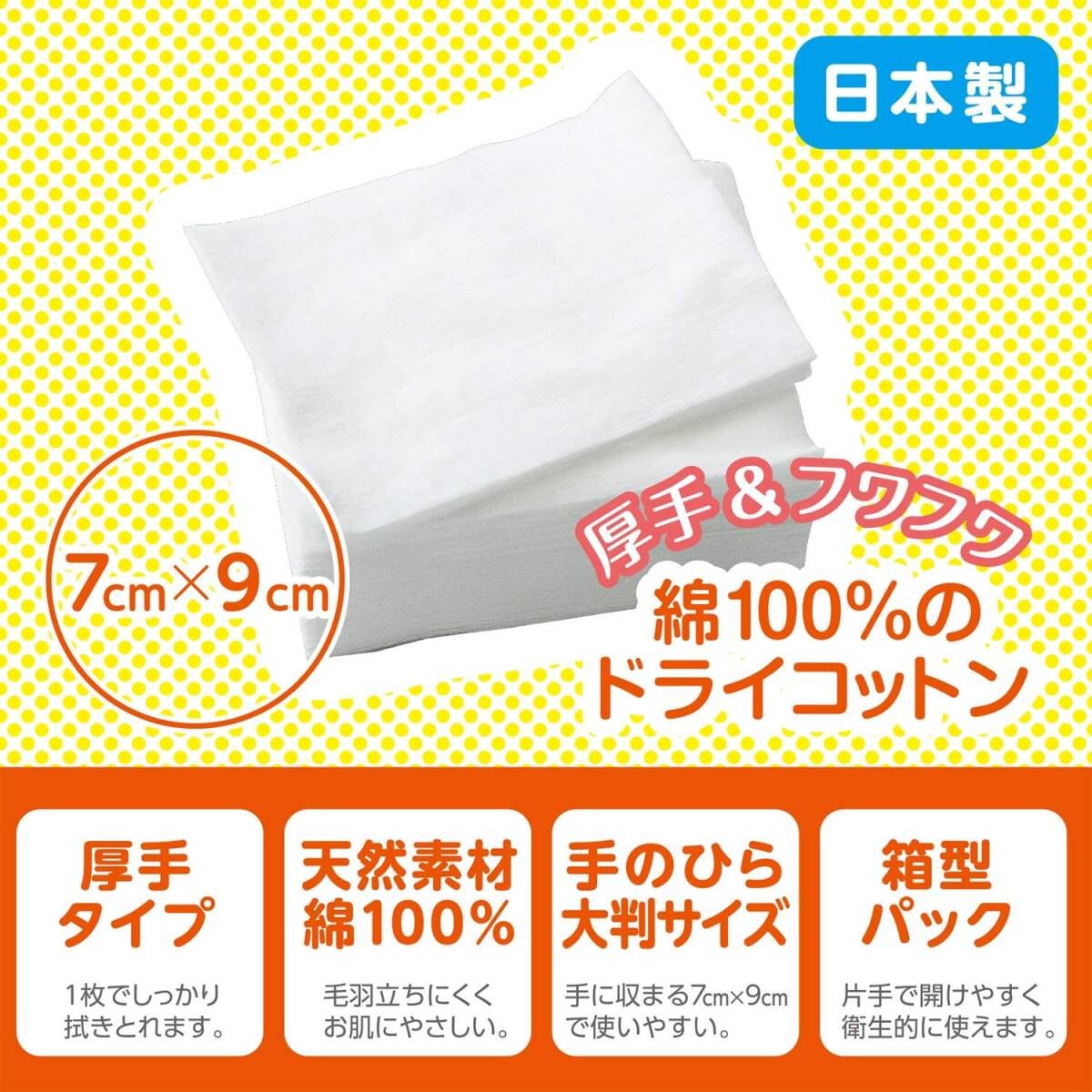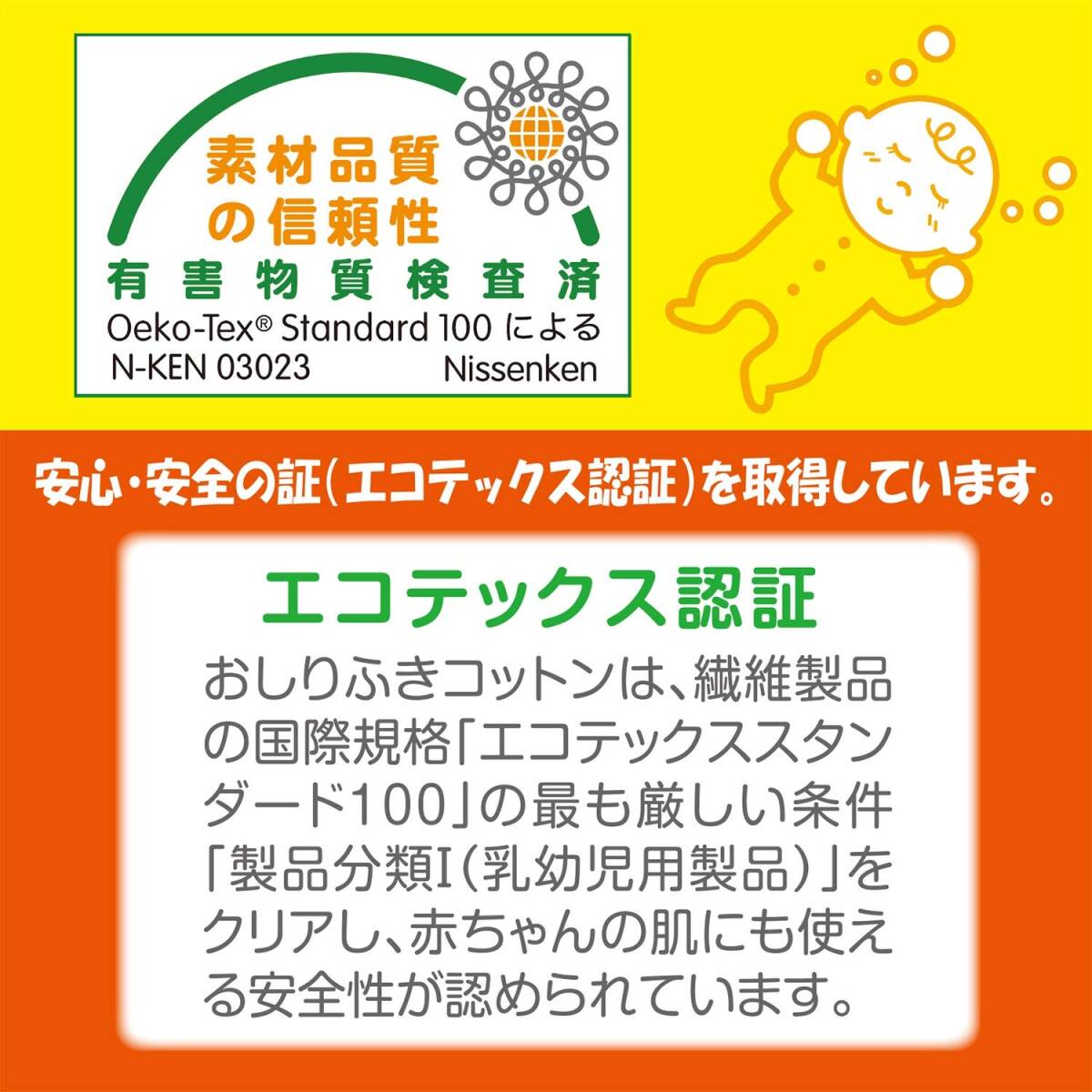説明 商品紹介 ●綿を使った天然繊維で、肌触りの良いコットンです。 ●赤ちゃんのおしりをやさしく拭くことができます。 ●ワンタッチ開閉のパックは、ほこりが入らず衛生的です。 ●基布サイズ:7×9cm(1枚) ●内容量:140枚入 【エコテックス認証とは】 おしりふきコットンは、繊維製品の国際規格「エコテックススタンダード100」の最も厳しい条件「製品分類I(乳幼児用製品)」をクリアし、赤ちゃんの肌にも使えることが認められています。 【使用上の注意】 ●開封後はフタをして、ホコリやゴミ等が入らない様に清潔に保管してください。 ●直射日光の当たる場所や火気を避け、高温・多湿の場所には保管しないでください。 ●水に溶けませんので、トイレ等に流さないでください。 ●お肌に合わない場合は使用を中止してください。 ※綿の表面あるいは内部に、黄色又は黒色の斑点状のものが見られることがありますが、これは綿の実殻ですので、ご使用上問題はありません。 より お肌がデリケートな赤ちゃんに おむつかぶれなどがひどい場合、おむつ交換の時に綿100%のコットンのご使用をお勧めします。ぬるま湯で浸してから軽くしぼって拭き取って下さい。おしりふきコットンは毛羽立ちの少ない特殊加工を施しており、脱落繊維がお肌に付きにくい。 使いやすい大きさにカット 赤ちゃんのおしりを拭くのに最適な大きさ7cm×9cmにカットしており、扱いやすくなっています。厚手タイプでしっかり拭き取れます。 ワンタッチ開閉の取り出しMパック パッケージはワンタッチで開閉するMパックを採用していますので、サッとコットンが取り出せて使用後はワンタッチで閉まります。衛生的にコットンを保管できます。