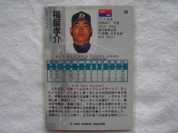 【BBM プロ野球カード 2002】No.138 福留孝介 中日ドラゴンズ【トレーディングカード トレカ ベースボールマガジン社】