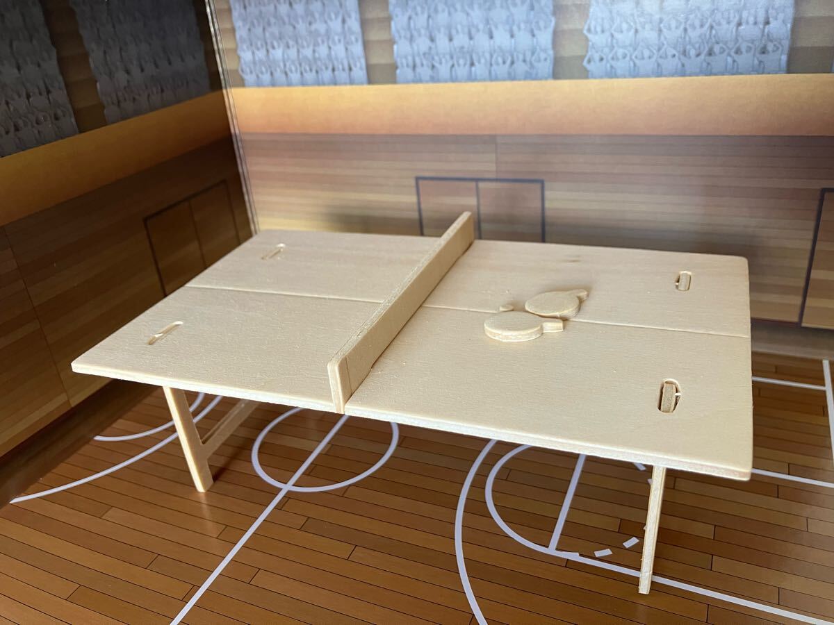 ハンドメイド 体育館背景 ミニチュア卓球台 ラケット2個と球付き ドールハウスやフィギュアに