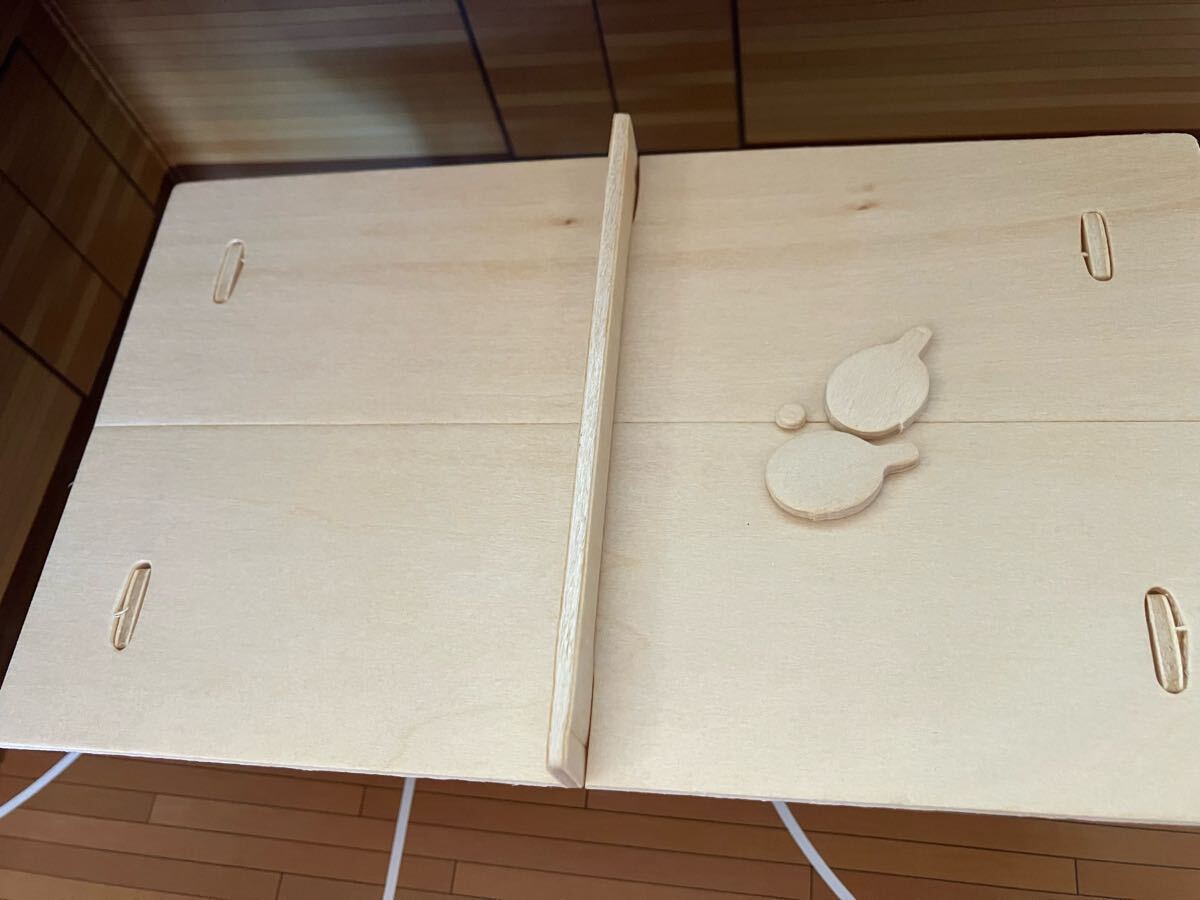 ミニチュアサイズの卓球台とラケット2個のセットです。ドールハウスの小物やフィギュアの撮影小物としていかがでしょうか。木製の温かみのあるデザインです。