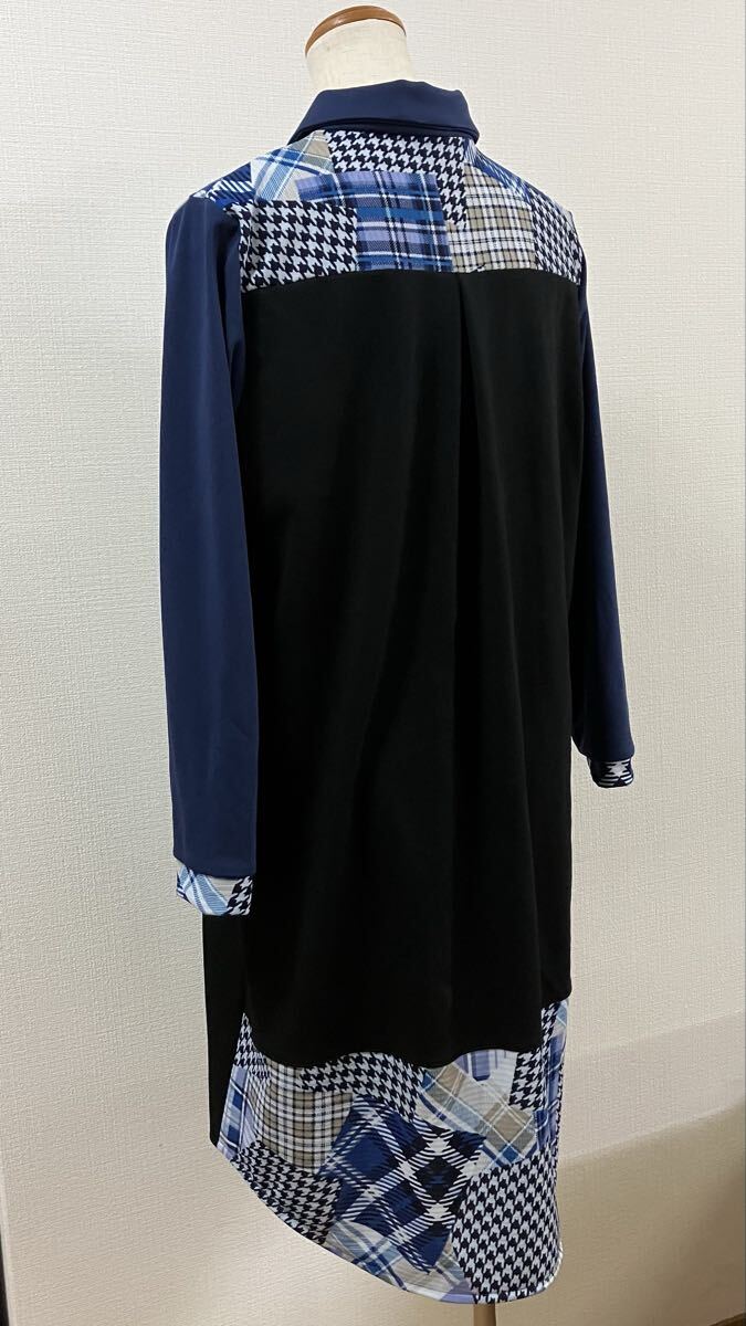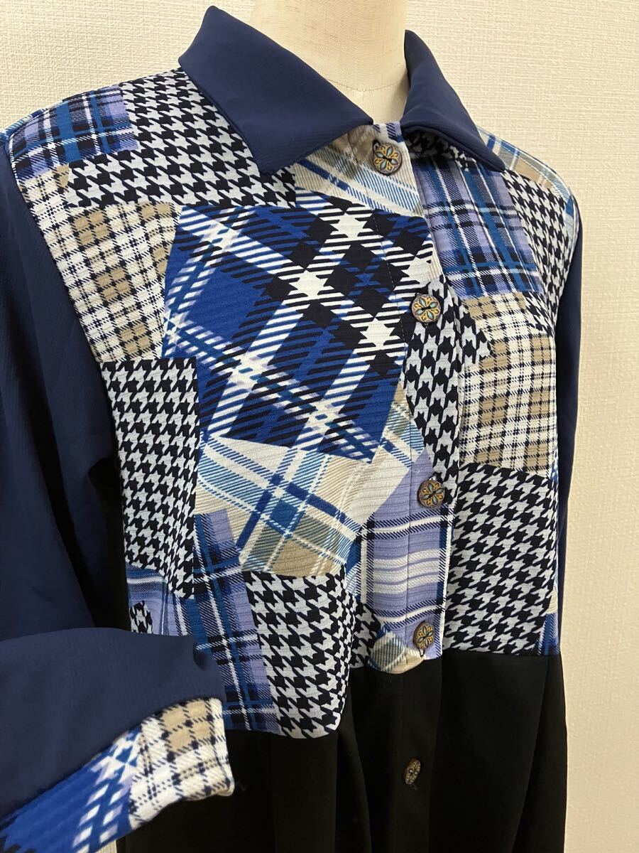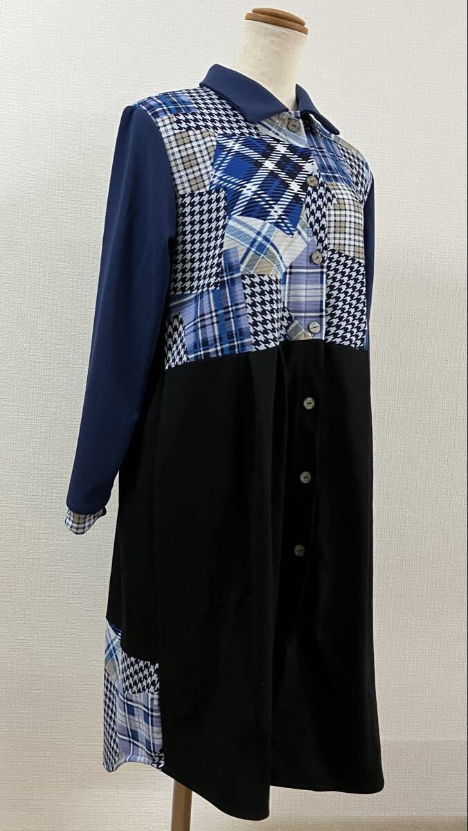 お色は紺系無地、黒系無地、紺や青、黒、グレー、水色などのチェック柄との切替シャツワンピースです。ワンピースとして着ても、前を開けてカーディガンとして着ても可愛い♪前後下りのヘムデザインで前にボタンが8個付いています。色は落ち着いた色味でまとめました。透け感なし伸縮性あり