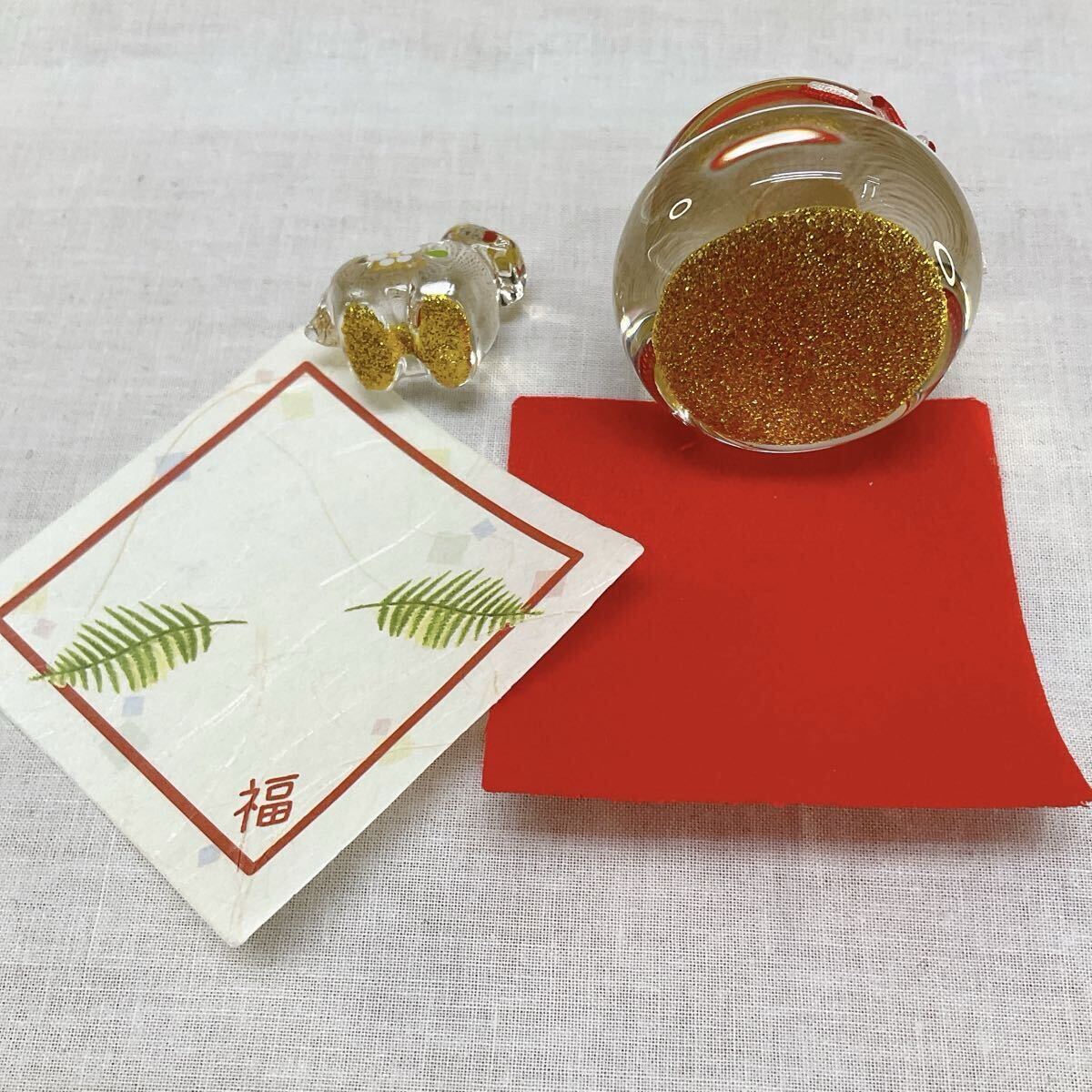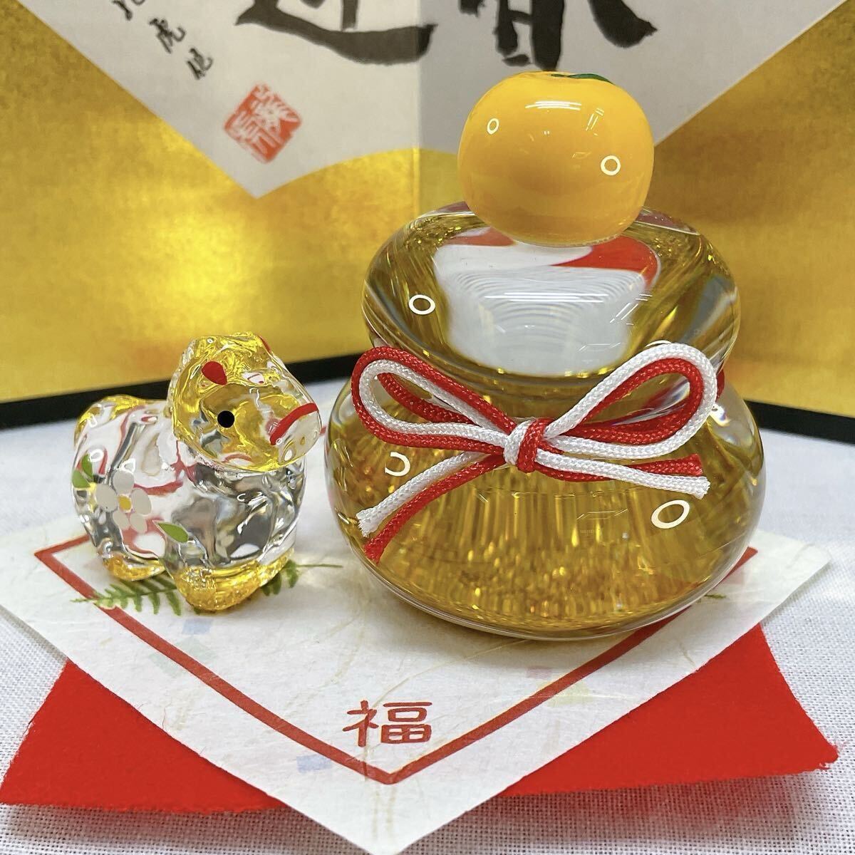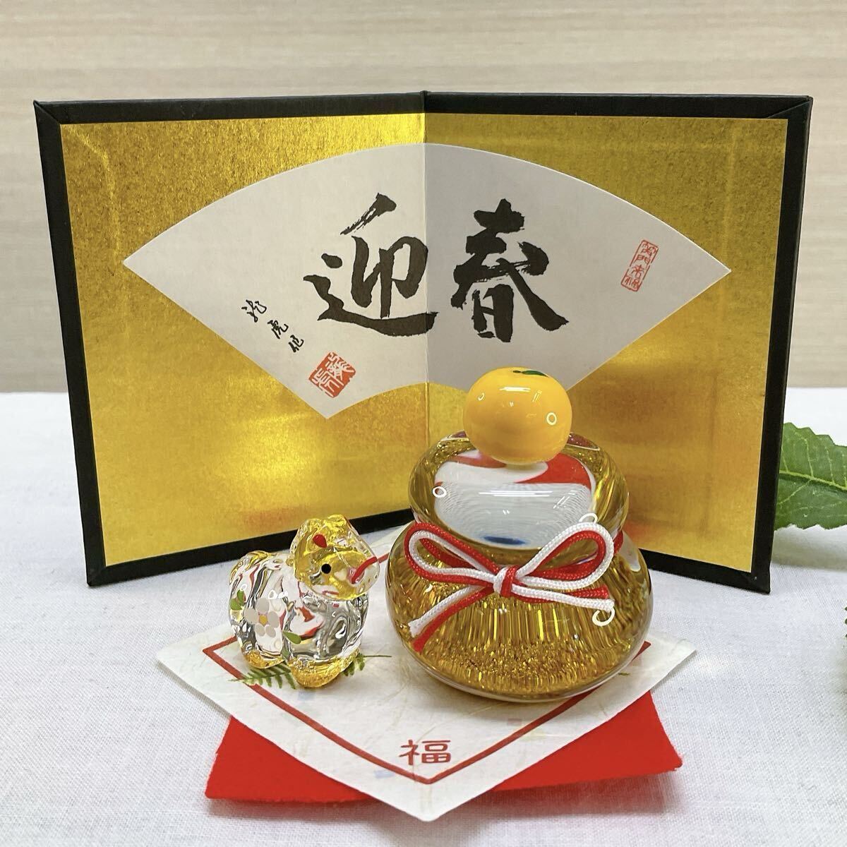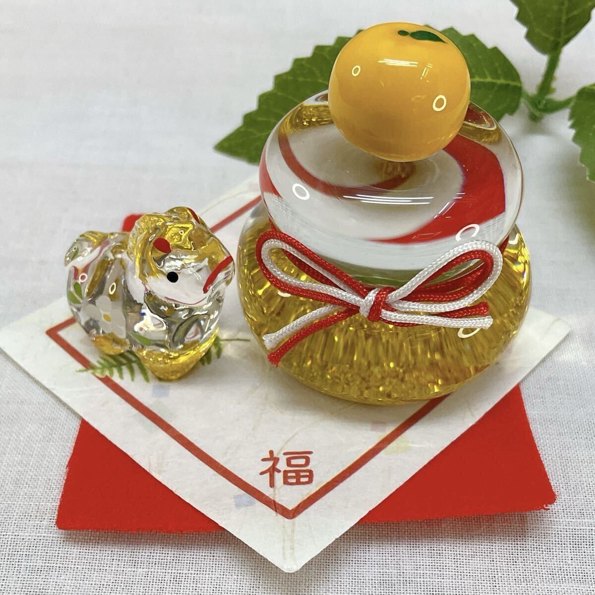 【ガラス製 鏡餅 &金彩硝子飾り 午 小】の2点 新品、未使用品 写真画像2枚目のデザインのお品をお届けします。