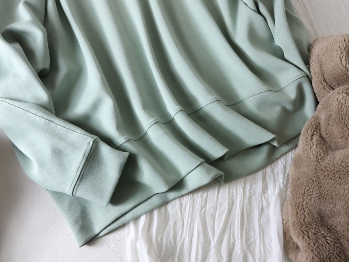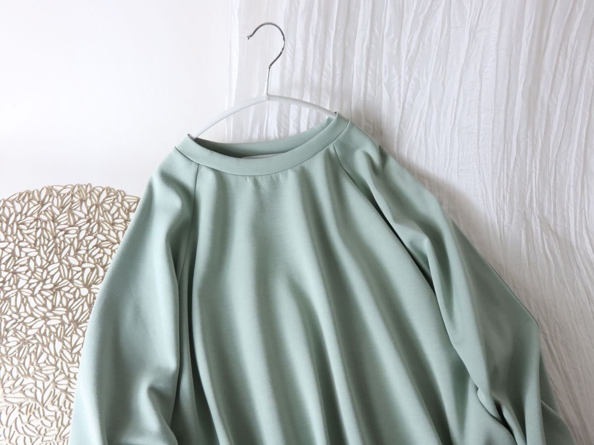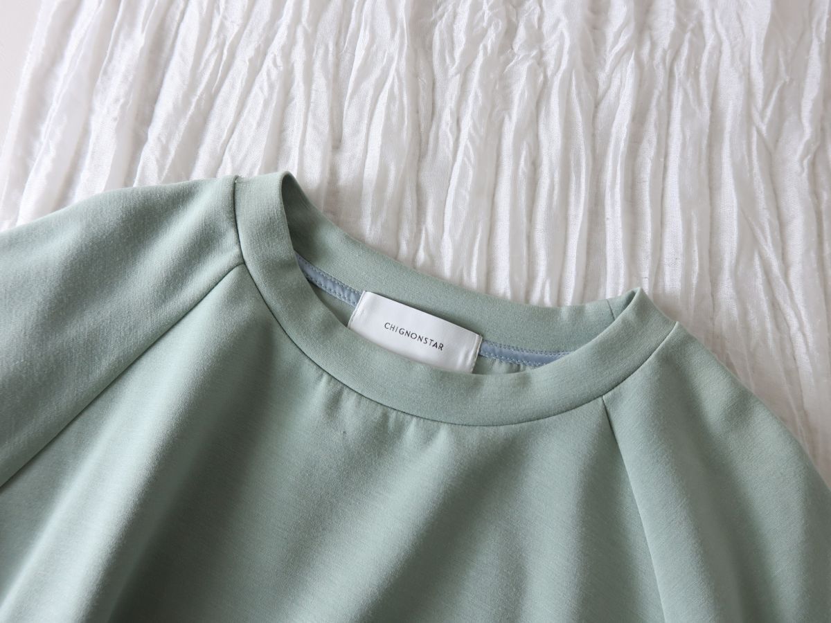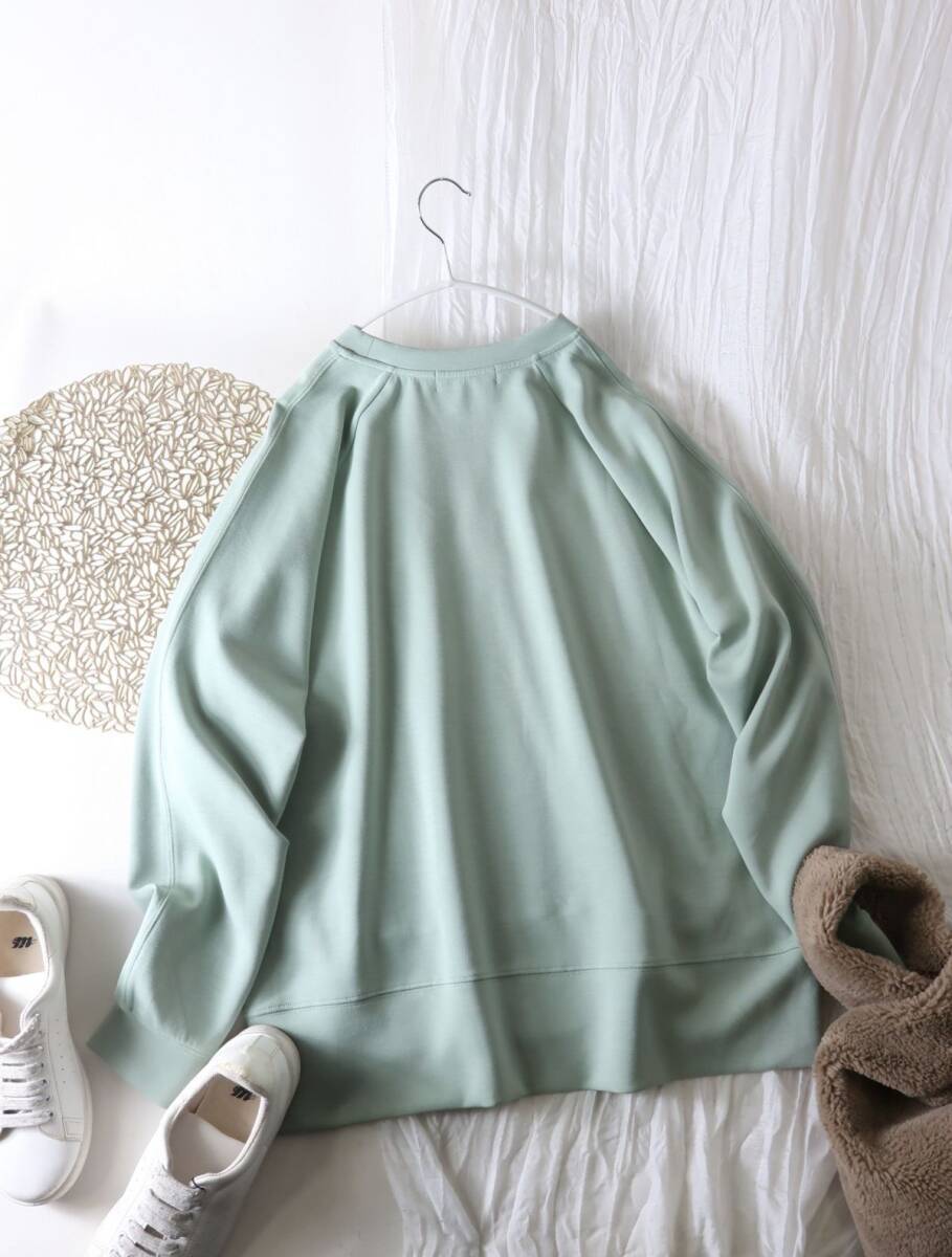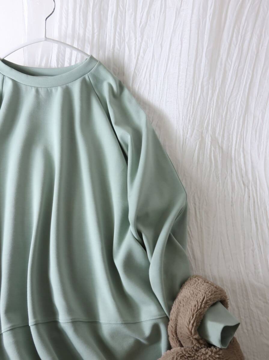 首元は詰まりすぎないクルーネックで、レイヤードをしたりアクセサリー合わせもしやすくて◎。