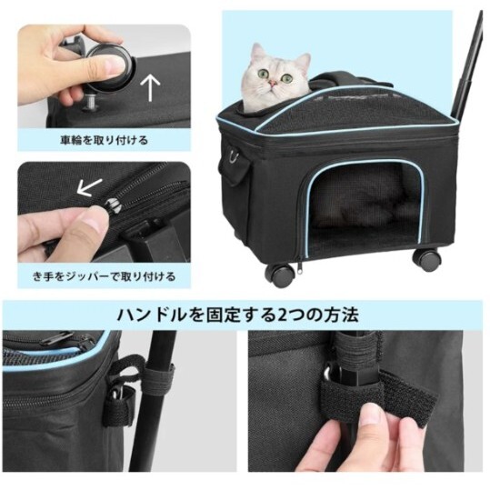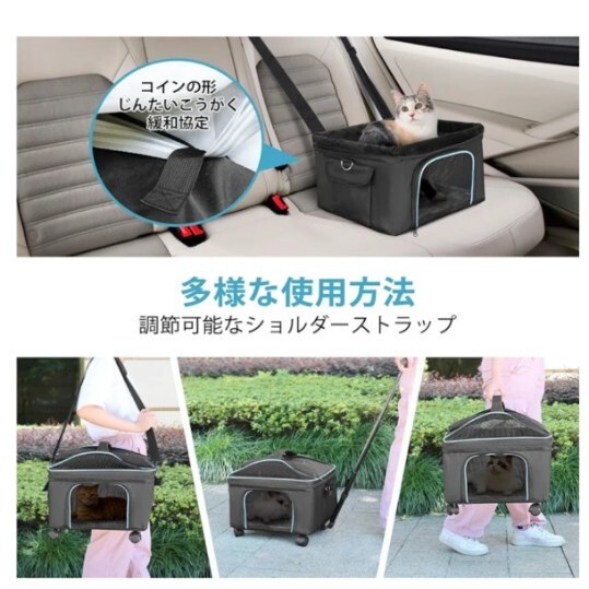 【静音キャスター】猫 キャリーは、ハンドル下部に4つの静音タイヤが付いているペット運搬車です。この車は片手で簡単に15キロ以内のペットをひっくり返せるように設計されています。普段使いのバックパックとしてもお使いいただけます。レバー部分は折りたたんで省スペースに収納可能です。