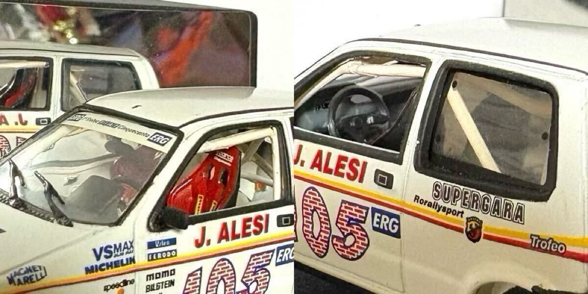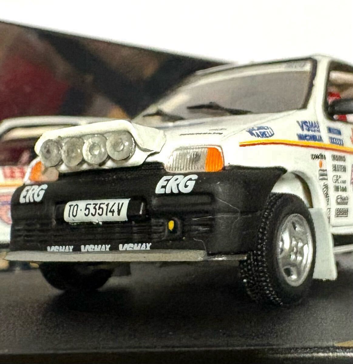 モデルは、両サイドにJ.ALESIの名前が入り、ナビゲーターも乗ったのでしょうか、助手席にもサベルトのシートベルトを装着したスパルコ製フルバケットシートが装備されています。フロントには4連ライトポッド、室内ロールケージ、グラベルロード用にミシュランのブロックタイヤやマッドフラップ等も装着されています。