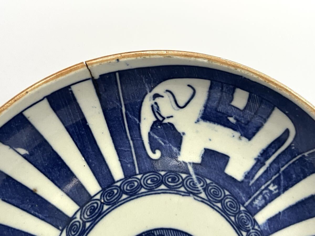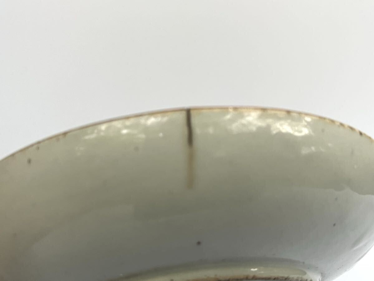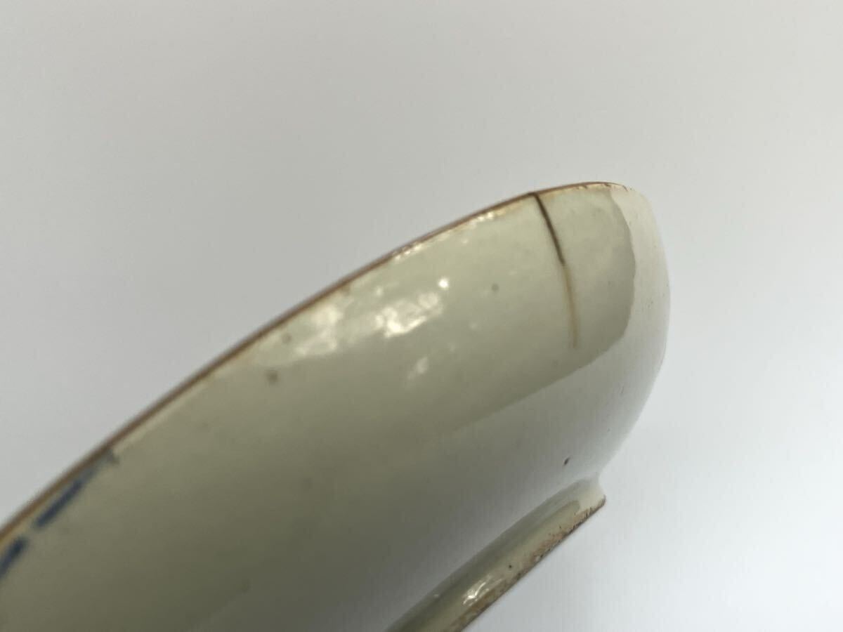 窯傷と窯傷からのニュウがあり、表面に一箇所小さな釉剥げがあります。印刷のズレも多少あります。