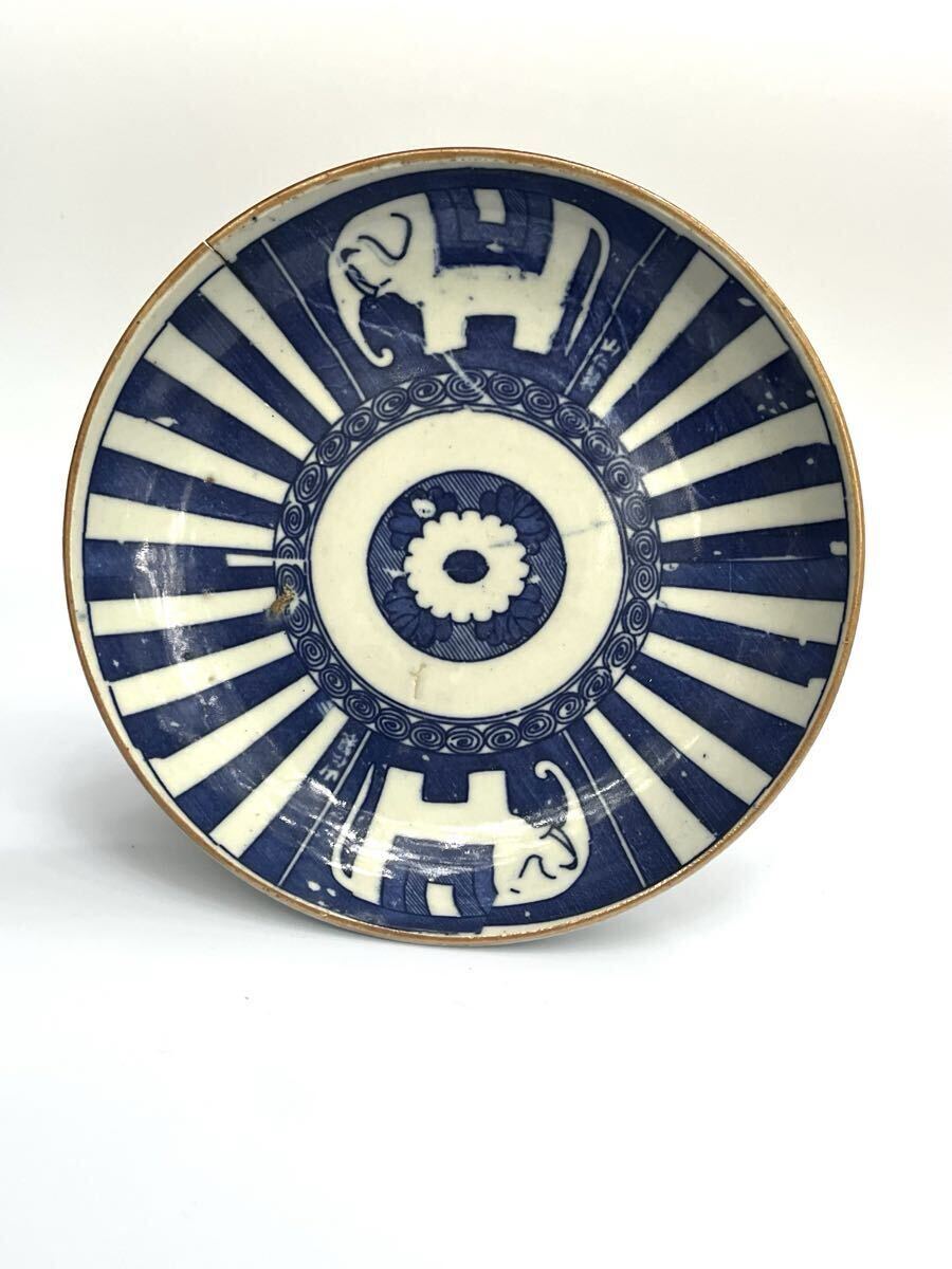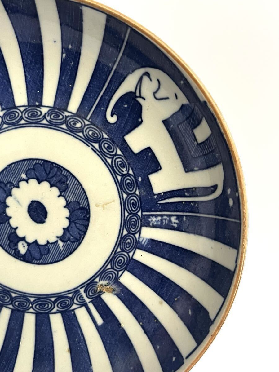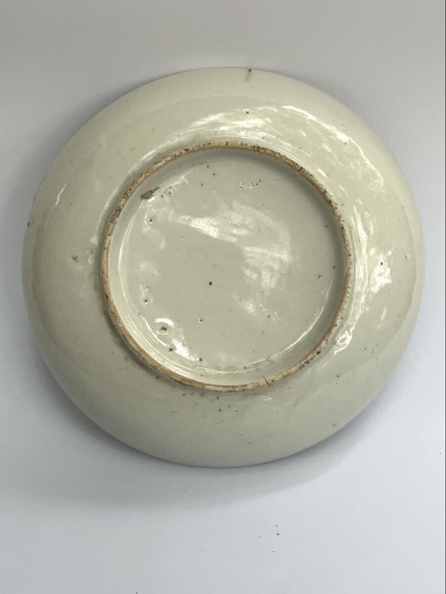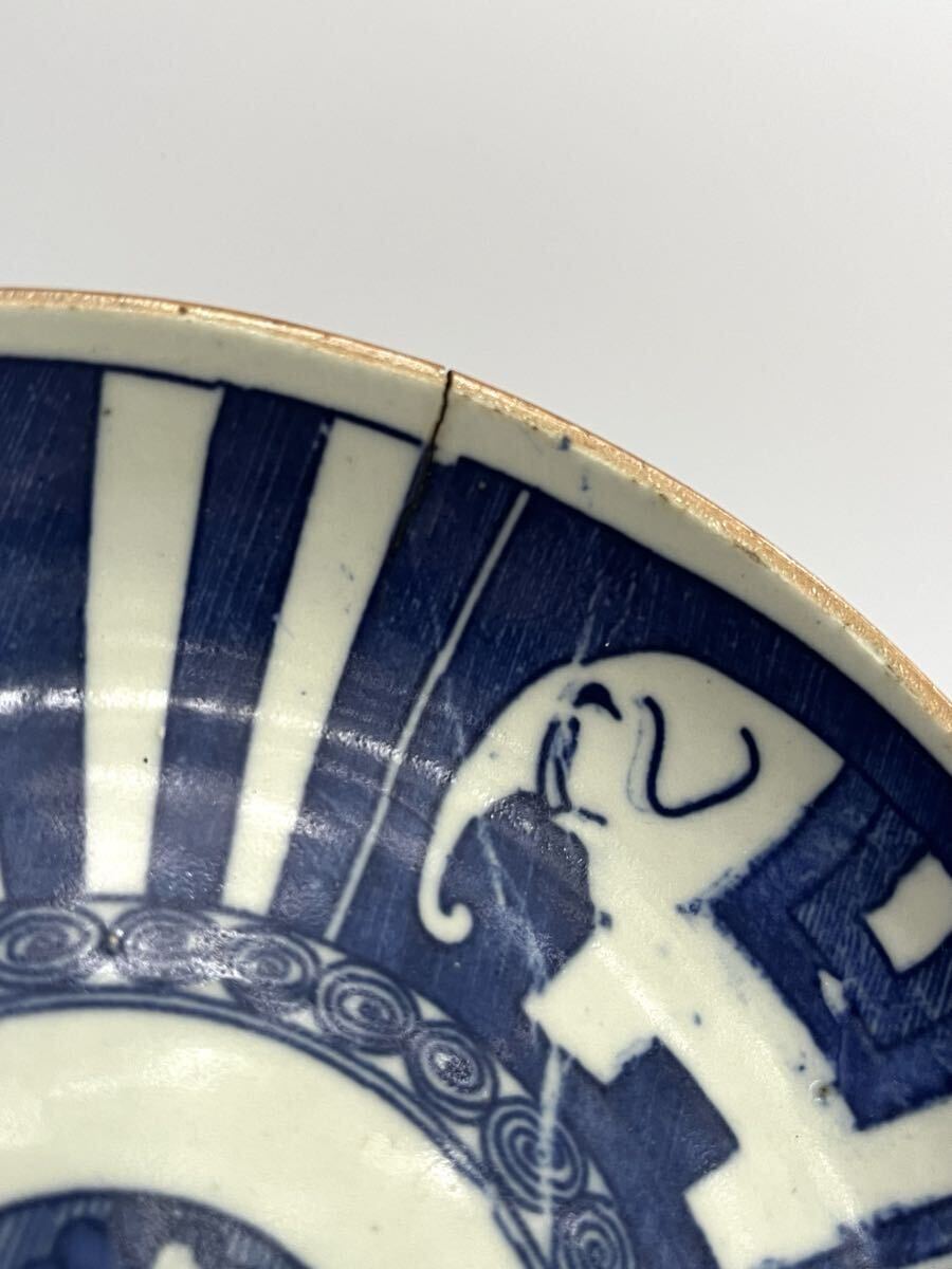 窯傷と窯傷からのニュウがあり、表面に一箇所小さな釉剥げがあります。印刷のズレも多少あります。