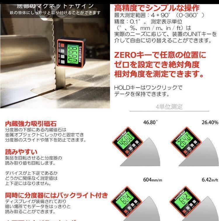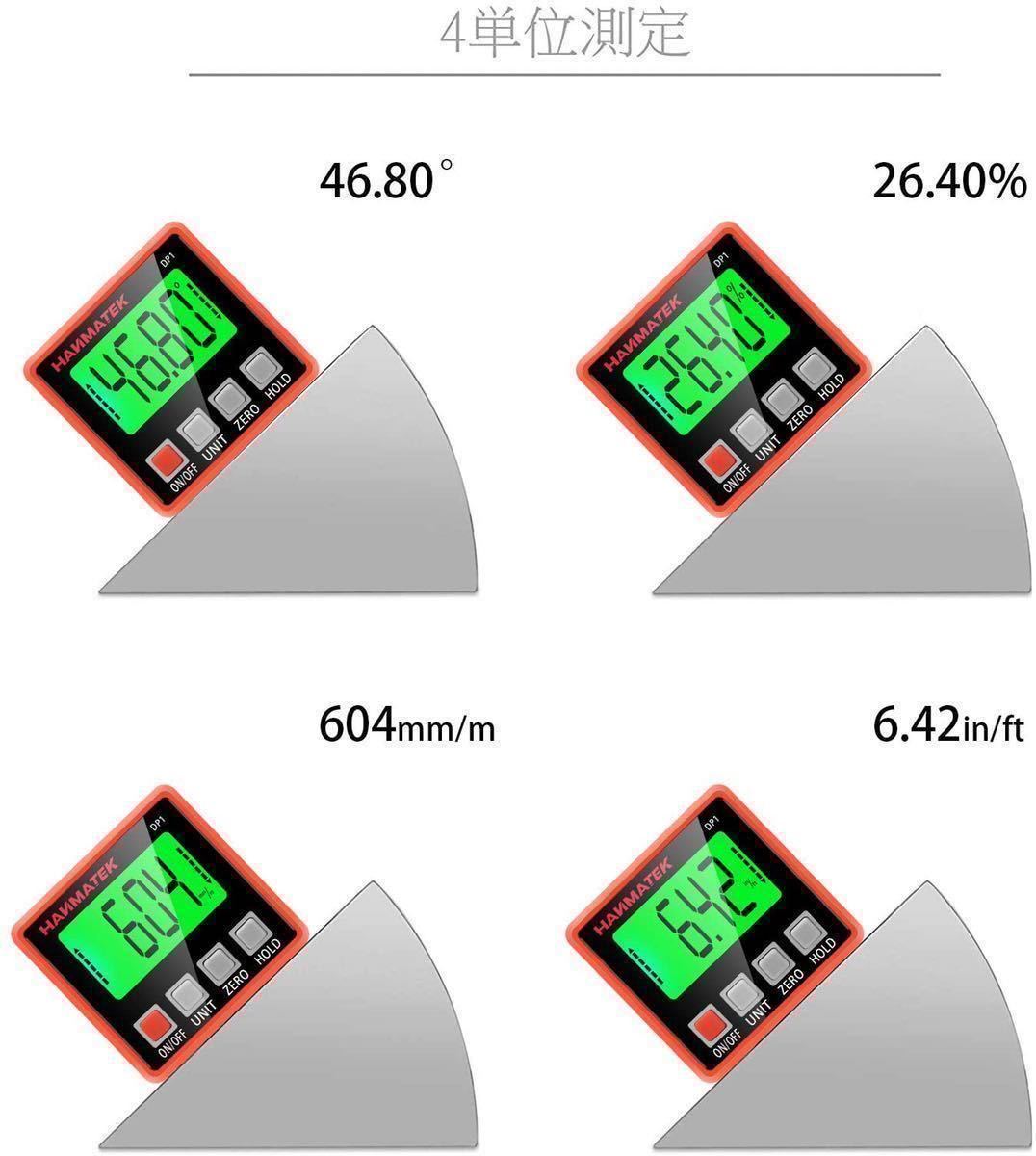 ①高精度でシンプルな操作:最大測定範囲:4 * 90°(0-360°);精度:0.1°。 測定表示単位(°、%、mm / m、in / ft)は、実際のニーズに応じて、装置のUNITキーを介して自由に切り替えることができます。 ZEROキーで任意の位置にゼロを設定でき、絶対角度、相対角度を測定できます。 HOLDキーはワンクリックでデータを保持できます。