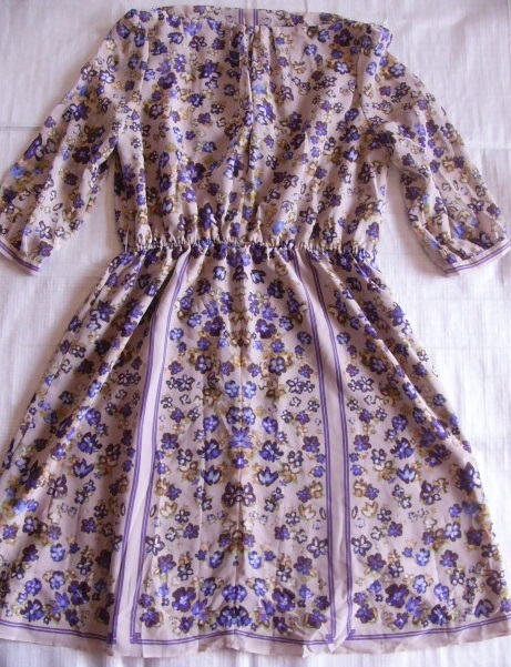 お色は、ピンクベージュ地に、こげ茶・青紫の濃淡・オフホワイト・ イエローベージュ・きみどりのお花柄プリントです。