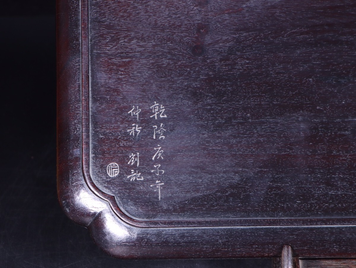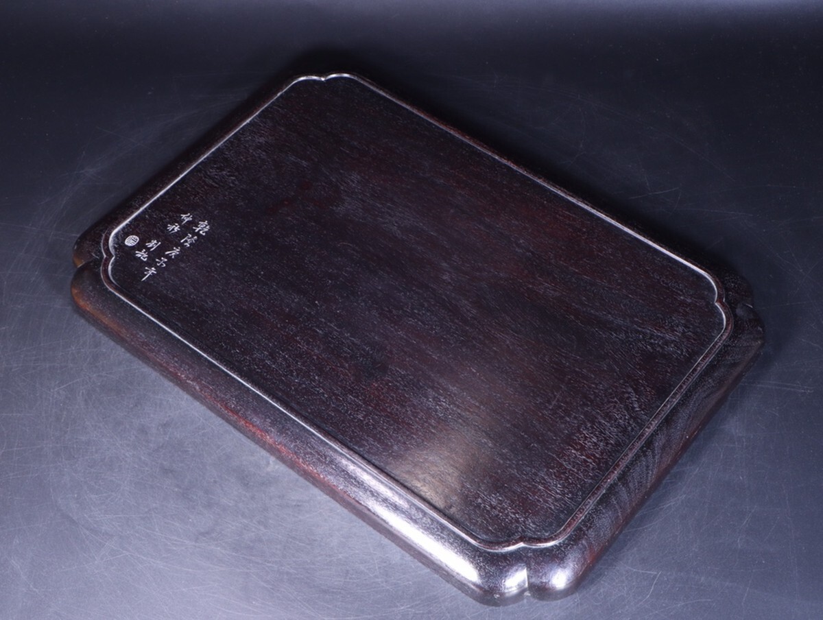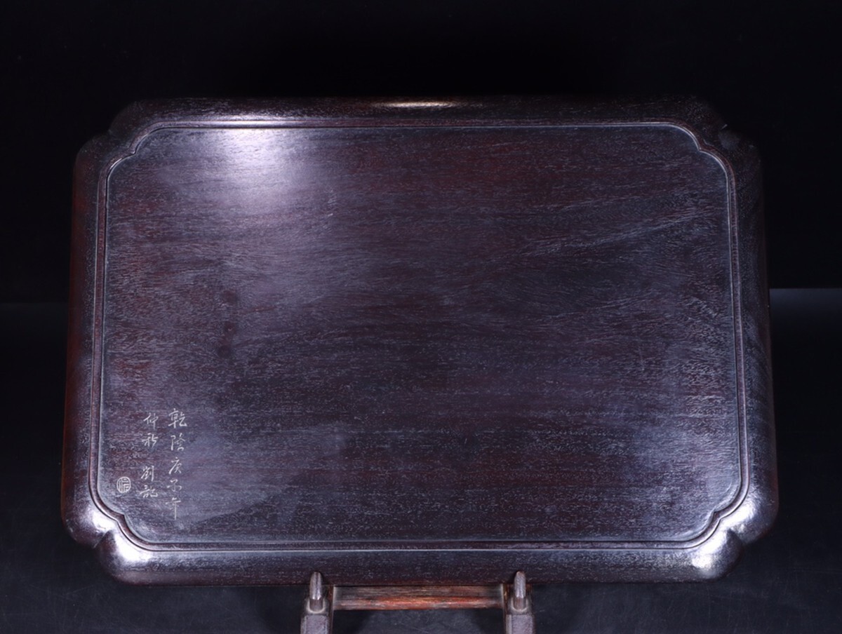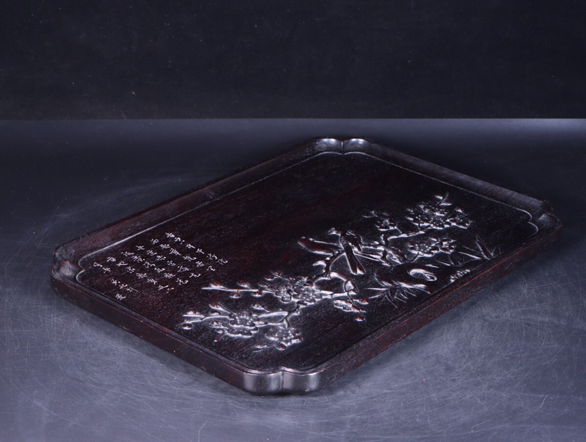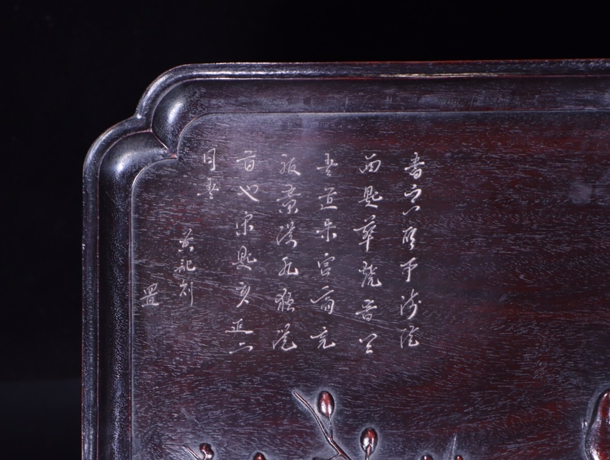 「清時代 老紫檀の木 鏤空彫り 喜上眉梢 詩文茶盤 置物盤」極細工 擺件 賞物 古美術 骨董品 蔵出