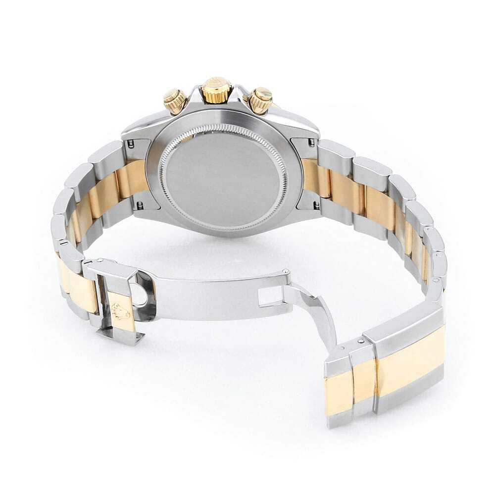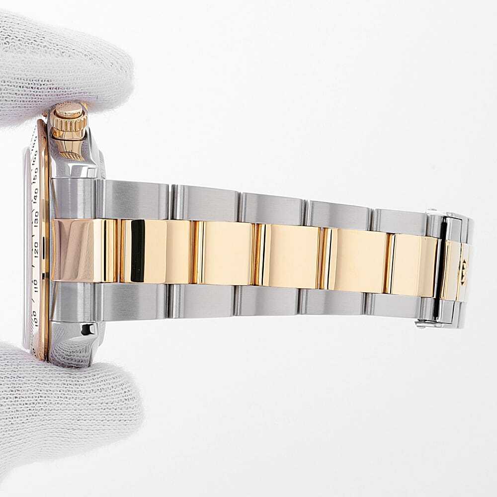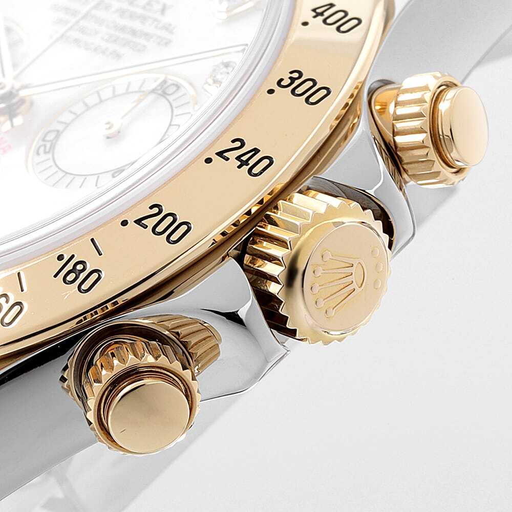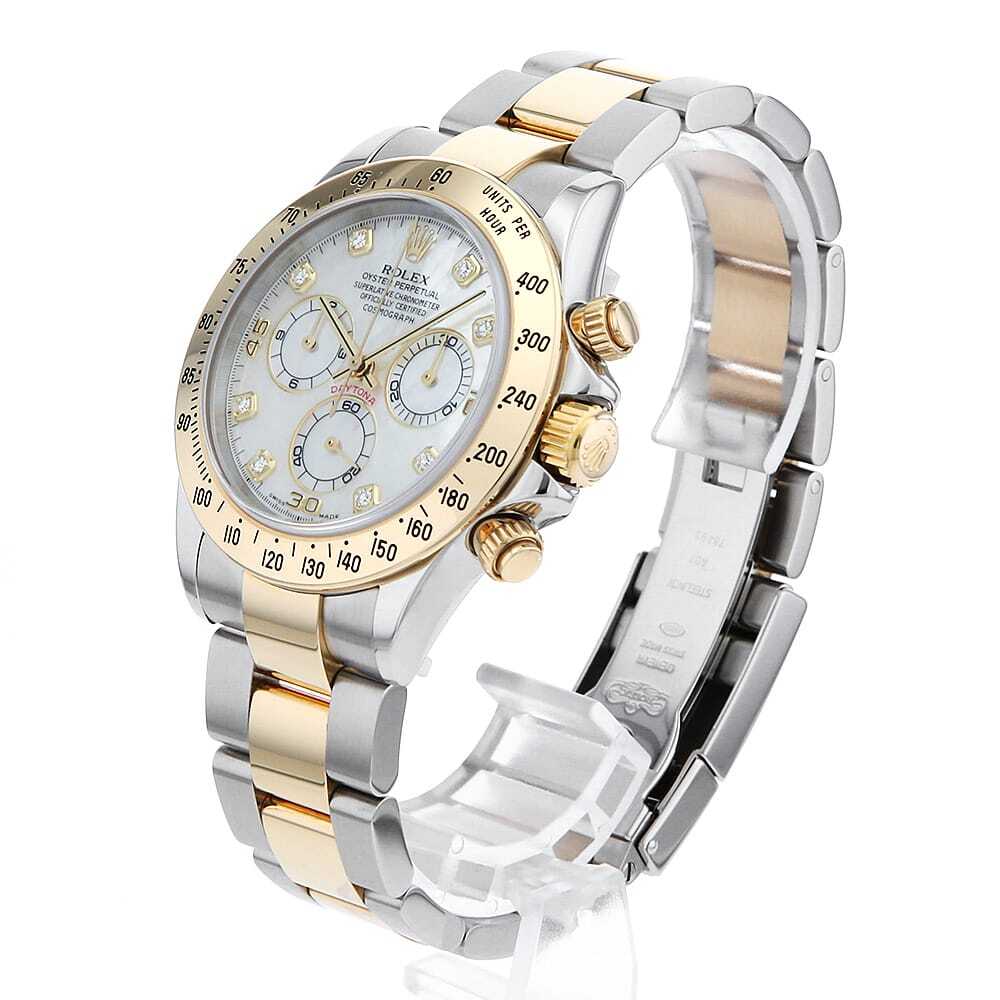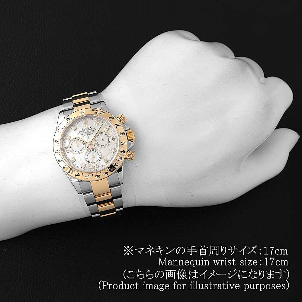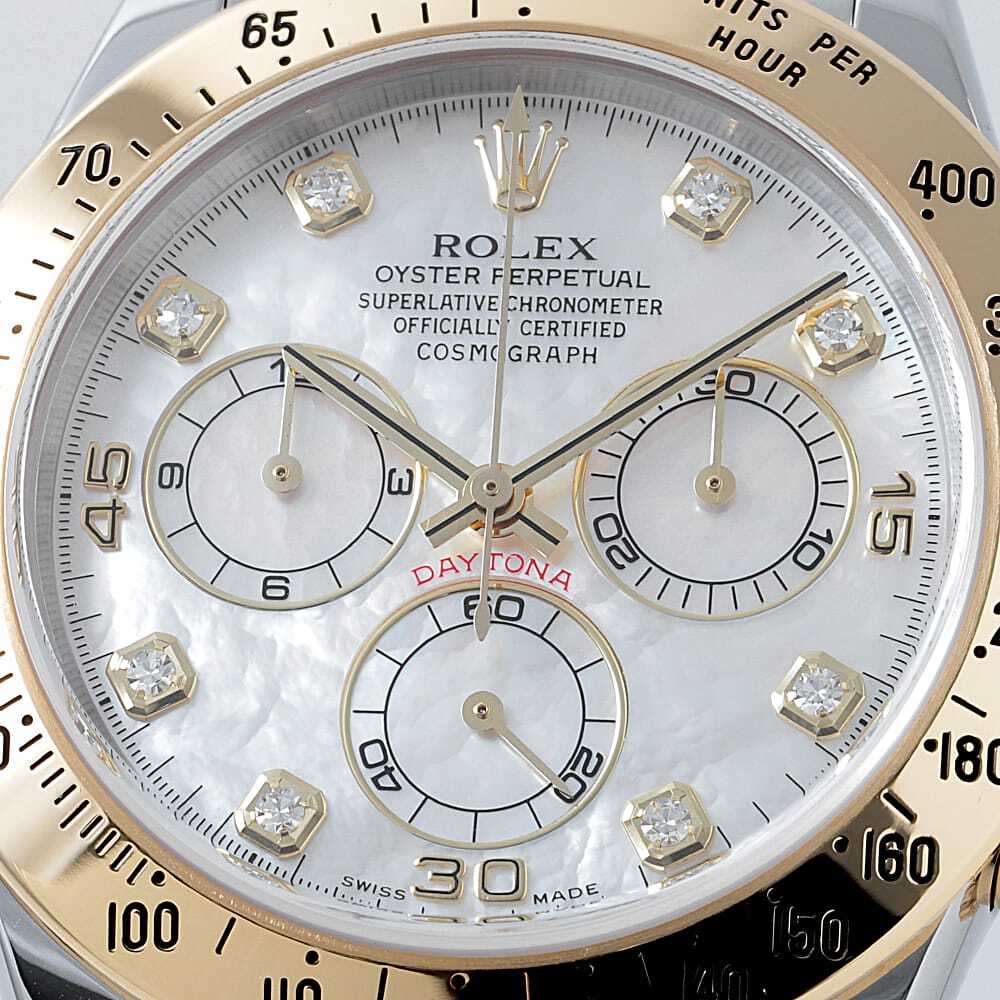 モデル情報 | ベゼルに直接タキメーターを刻み、レーシングイメージが強いモデルとして発表されたコスモグラフ デイトナ。スポーティで高級感あふれるデザインは、ロレックスの数多いモデルの中でも一番人気と言っても過言ではありません。こちらはインデックスに8粒のダイヤモンドが配されており、輝きの相乗効果によりとても華やかで魅力的な一本に仕上がっています。 |