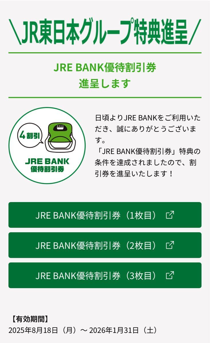 JRE BANK優待割引券3枚セットです。 返品、交換はできません。 JRE BANK優待割引券番号とパスワードを取引ナビでご連絡します、利用方法がわかる方のみご購入ください。