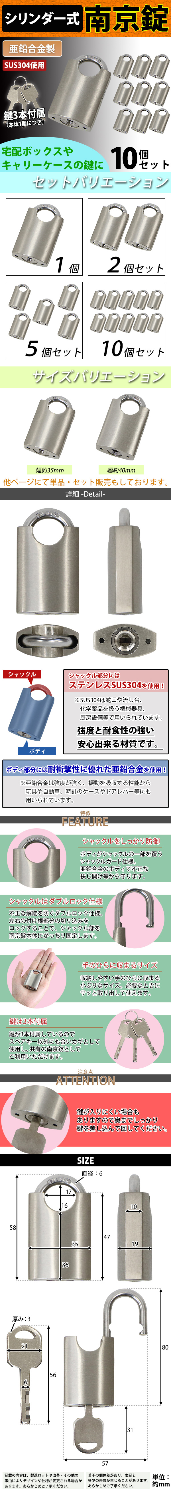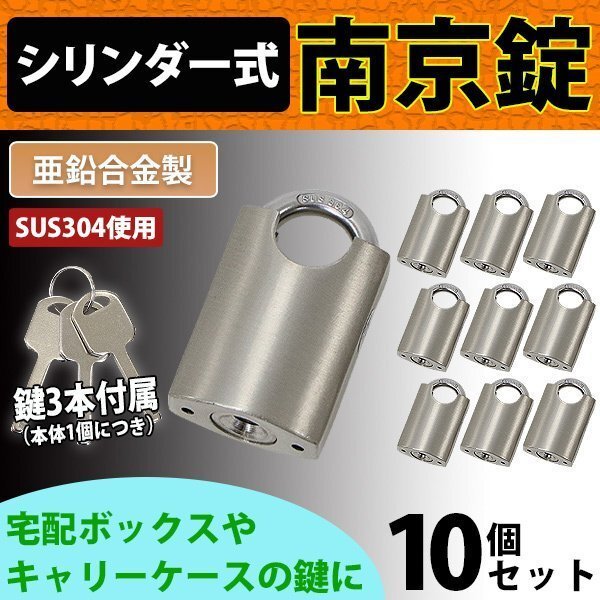 | 商品名 | 送料無料 シリンダー式 亜鉛合金製 南京錠 幅約35mm シャックルガード付き 10個 シャックル径約6mm 鍵3本付属 SUS304 ステンレス シリンダー 鍵式 ダブルロック ガードロック 錠前 盗難防止 防犯 宅配ボックス ロッカー ポスト 倉庫 鍵 nanking93510p |