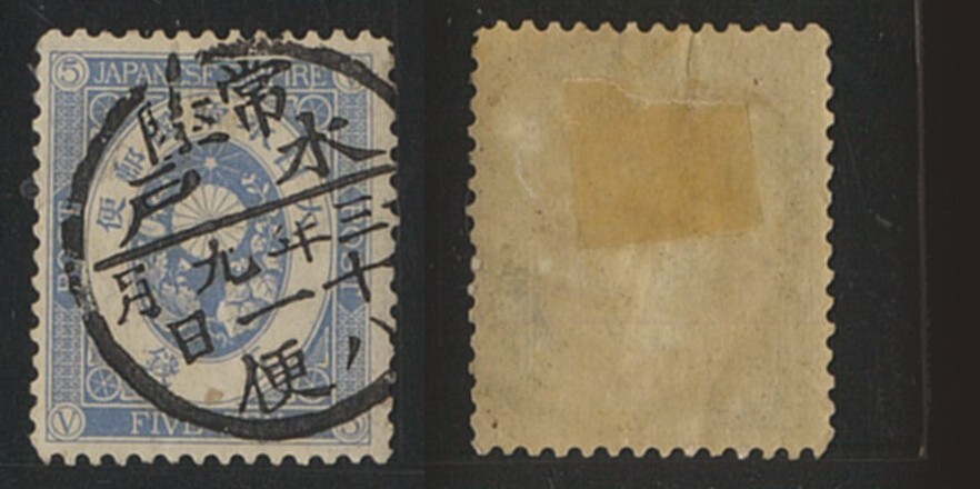 日本切手 使用済 U小判 5銭 後期13 丸一型日付印 水戸 にぶ青 ヒンジ付